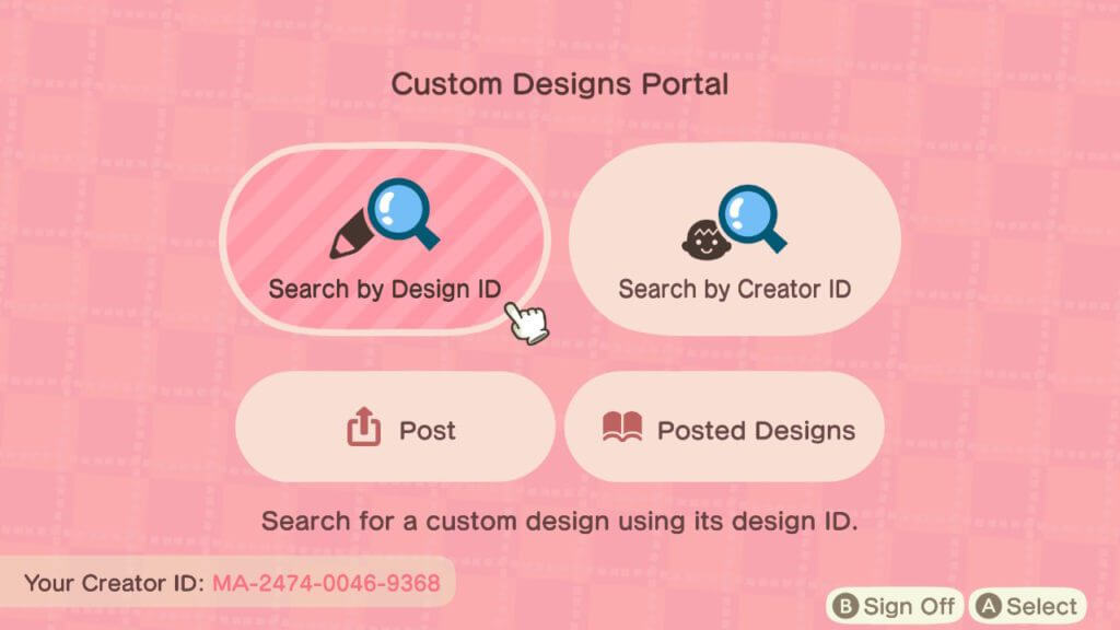 You can search for designs by the design ID or by the creator ID. The design ID is specific to one design and the creator ID will show all posted designs from one player/creator. This can be easier to use especially if you are downloading more than one design from the same creator. Also, the creator ID is only numbers while the design ID is a combination of letters and numbers.