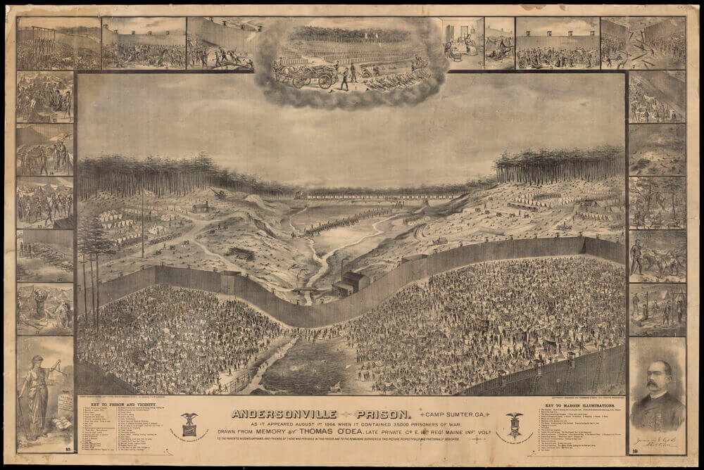 At first glance, Thomas O’Dea’s drawing of Andersonville Prison is overwhelming in its detail. Thousands of Union prisoners of war languish in the hot Georgia sun as more prisoners stream into the camp. Nineteen illustrations along the border depict significant happenings in the history of the camp. Constructed by the Confederacy in 1864, Andersonville was the most notorious prison camp of the Civil War. Over 13,000 prisoners died in the prison as a result of malnutrition, disease, and exposure. A veteran of the 16th Maine Volunteer Infantry, O’Dea was captured in 1864 and sent to Andersonville. He knew the horrors of the camp firsthand. In 1879, O’Dea began working on his illustration after seeing a picture of Andersonville in which the camp appeared “well regulated” with “nice wall tents erected in regulation style, giving the place an appearance of cleanliness and order.” O’Dea was outraged. He recalled, “in all the annals of civilization and barbarism, there never was, and I doubt never will be, such another place as ANDERSONVILLE.”1 Despite having no artistic experience, O’Dea spent over five years producing the realistic and detailed depiction of the suffering Union soldiers endured. He drew the entire image from his own memories which he said would be photographed in his memory until his dying day.