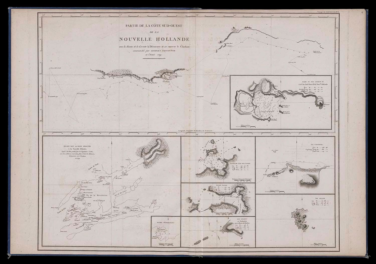 Full Title: Partie de la Côte Sud-Ouest de la Nouvelle Hollande avec les Routes de la Corvette la Découverte et sa conserve le Chatham commandés par Georges Vancouver en l'Année 1791. / Rade du Roi George III. à la Côte Sud Ouest de la Nouv.le Hollande / Dusky Bay ou Baie Obscure à laNouvelle Zélande, Copiée du Plan publié par le Capitaine Cook, avec les additions et corrections faites à bord des Batimens, la Discovery et le Chatham en 1791. / Havre de L'île de L'Ancre / Havre Facile / Le Snares / Île Chatham / île Oparo