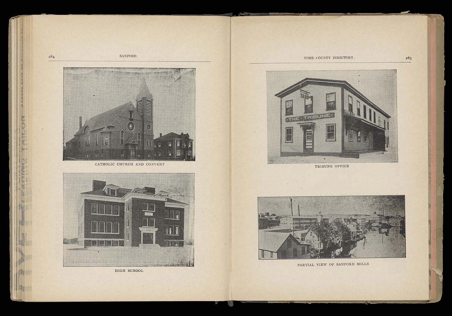Name: Sanford. Catholic Church and Convent / High School / Tribune Office / Partial View of Sanford Mills