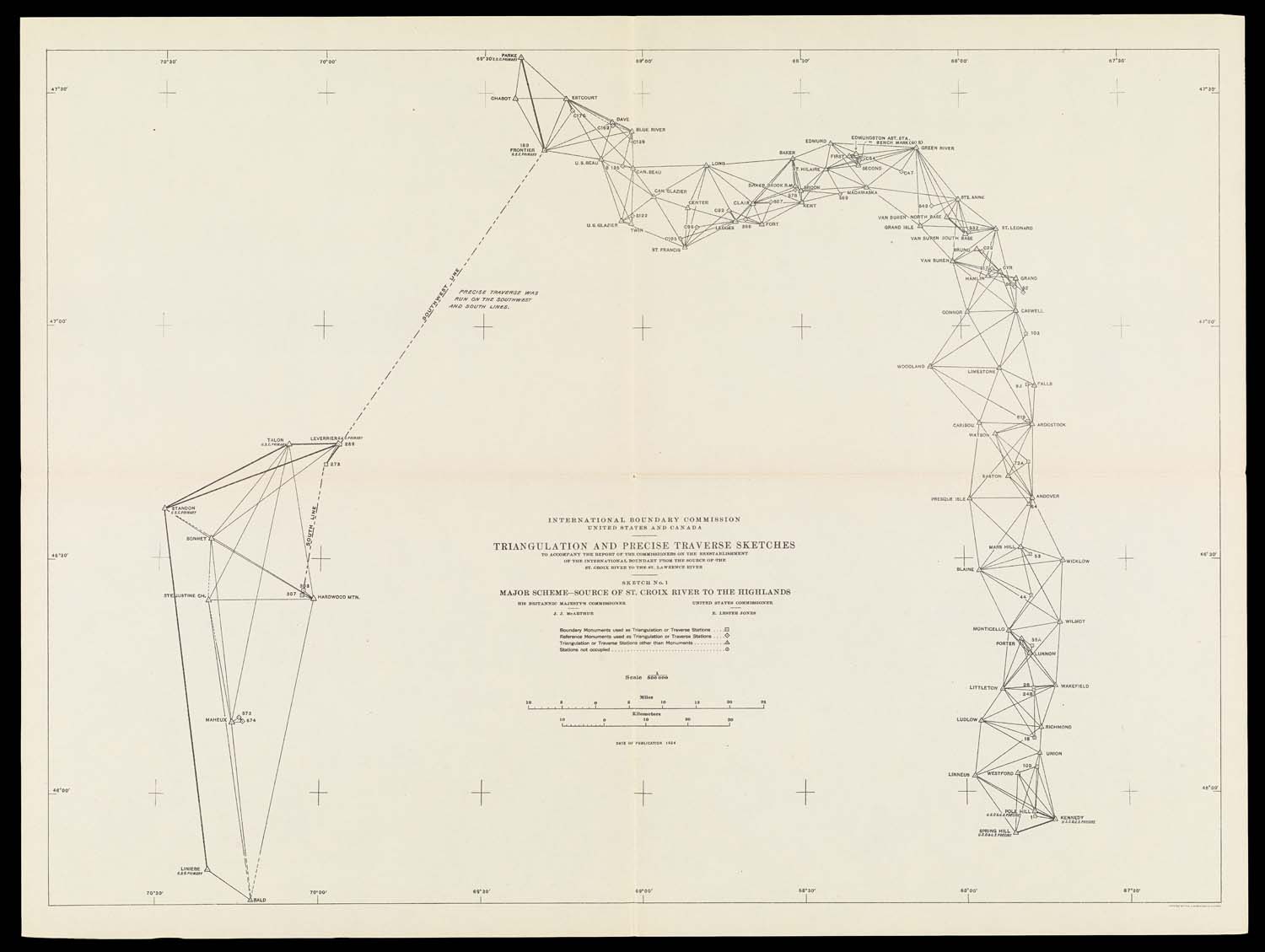 Name: International Boundary Commission United States and Canada Triangulation and precise traverse sketches to accompany the report of the commissioners on the reestablishment of the international boundary from the source of the St. Croix River to the St. Lawrence River Sketch No. 1 Major Scheme - Source of St. Croix River to the Highlands