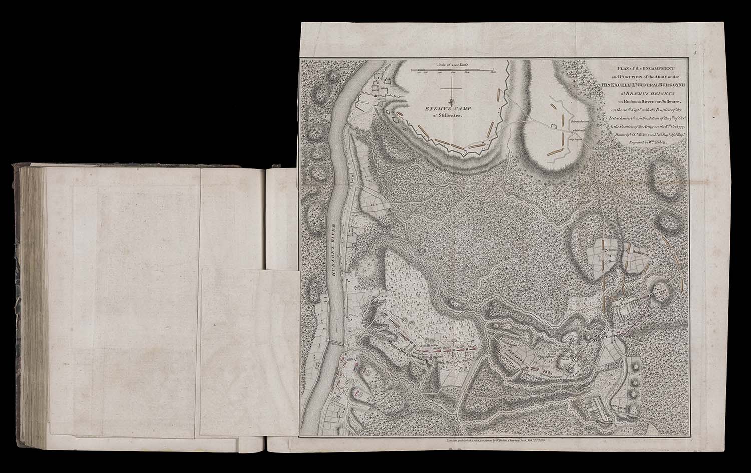 Full Title: Plan of the Encampment and Position of the Army under His Excelly. Lt. General Burgoyne at Bræmus Heights on Hudson's River near Stillwater, on the 20th Sept. with the Position of the Detachment &c. in the Action of the 7th of Octr. & the Position of the Army on the 8th Octr. 1777. Drawn by W.C. Wilkinson Lt. 62 Regt. afst. Engr. Engraved by Wm. Faden. [overlay peeled back]