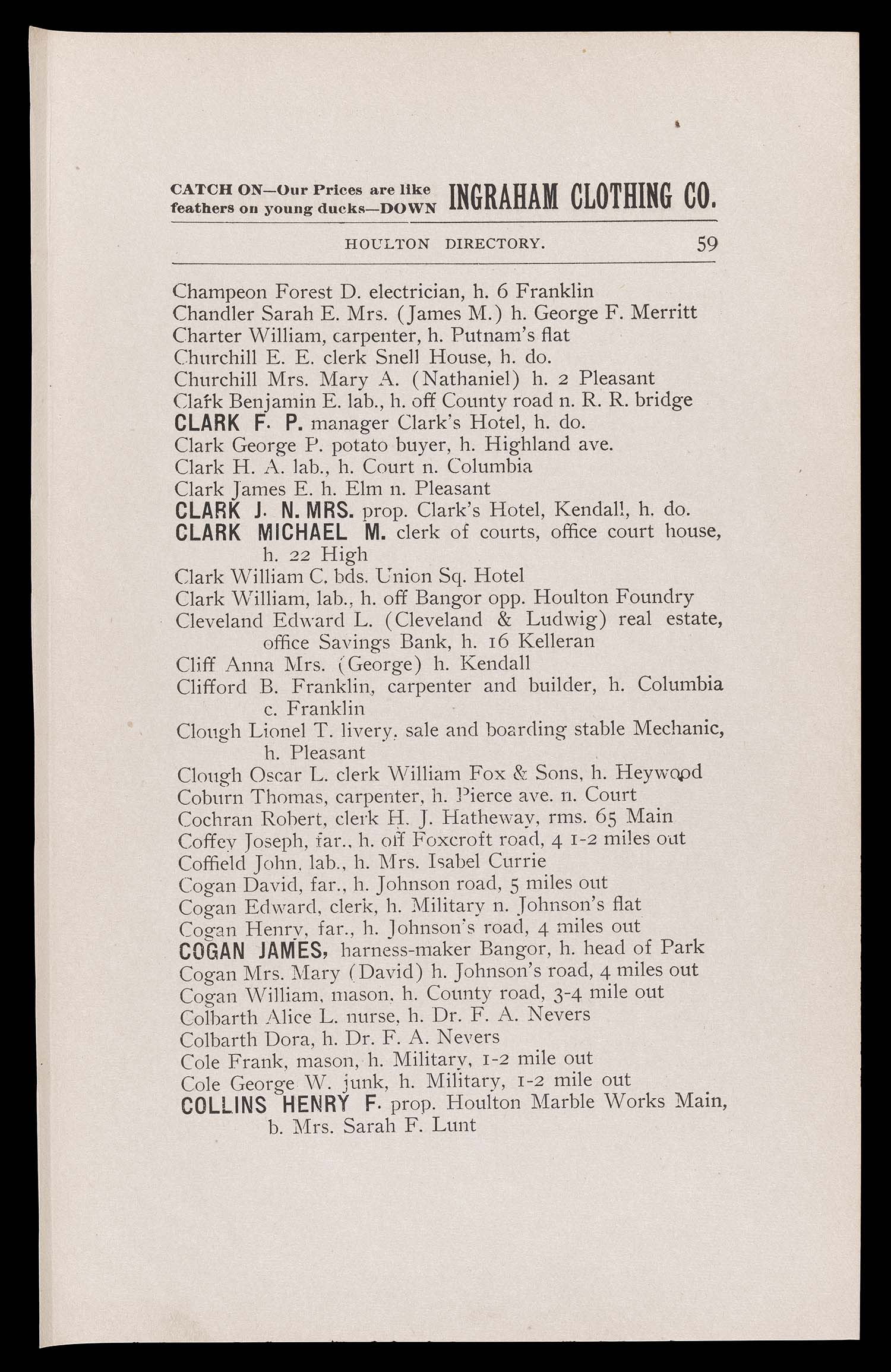 ↑ Parent: The Houlton directory, 1900 : a complete index to the residents, business, streets, etc. of the town of Houlton, Aroostook County, Maine with other useful information