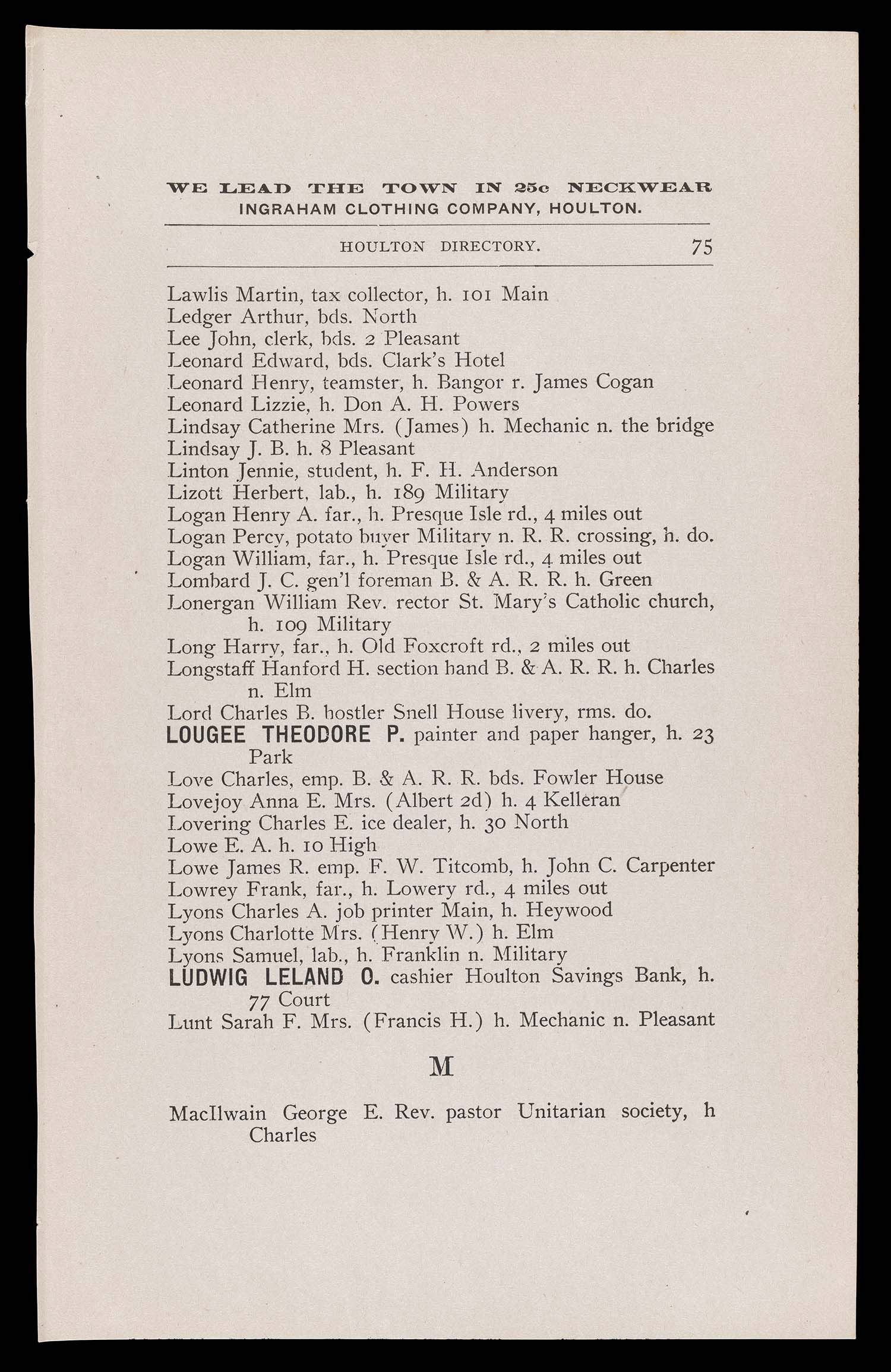 ↑ Parent: The Houlton directory, 1900 : a complete index to the residents, business, streets, etc. of the town of Houlton, Aroostook County, Maine with other useful information