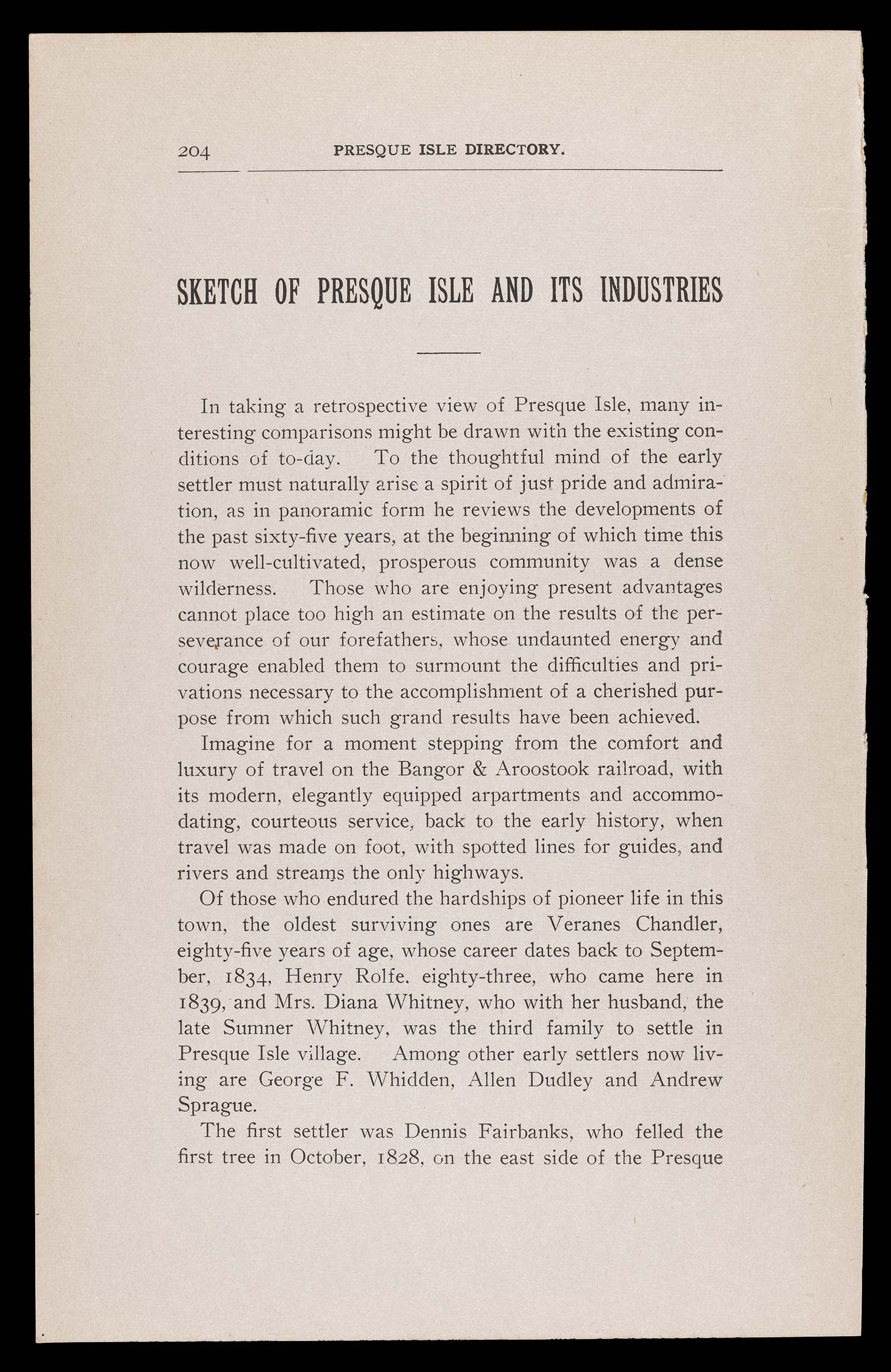 Name: The Presque Isle Directory. Sketch of Presque Isle and its Industries.