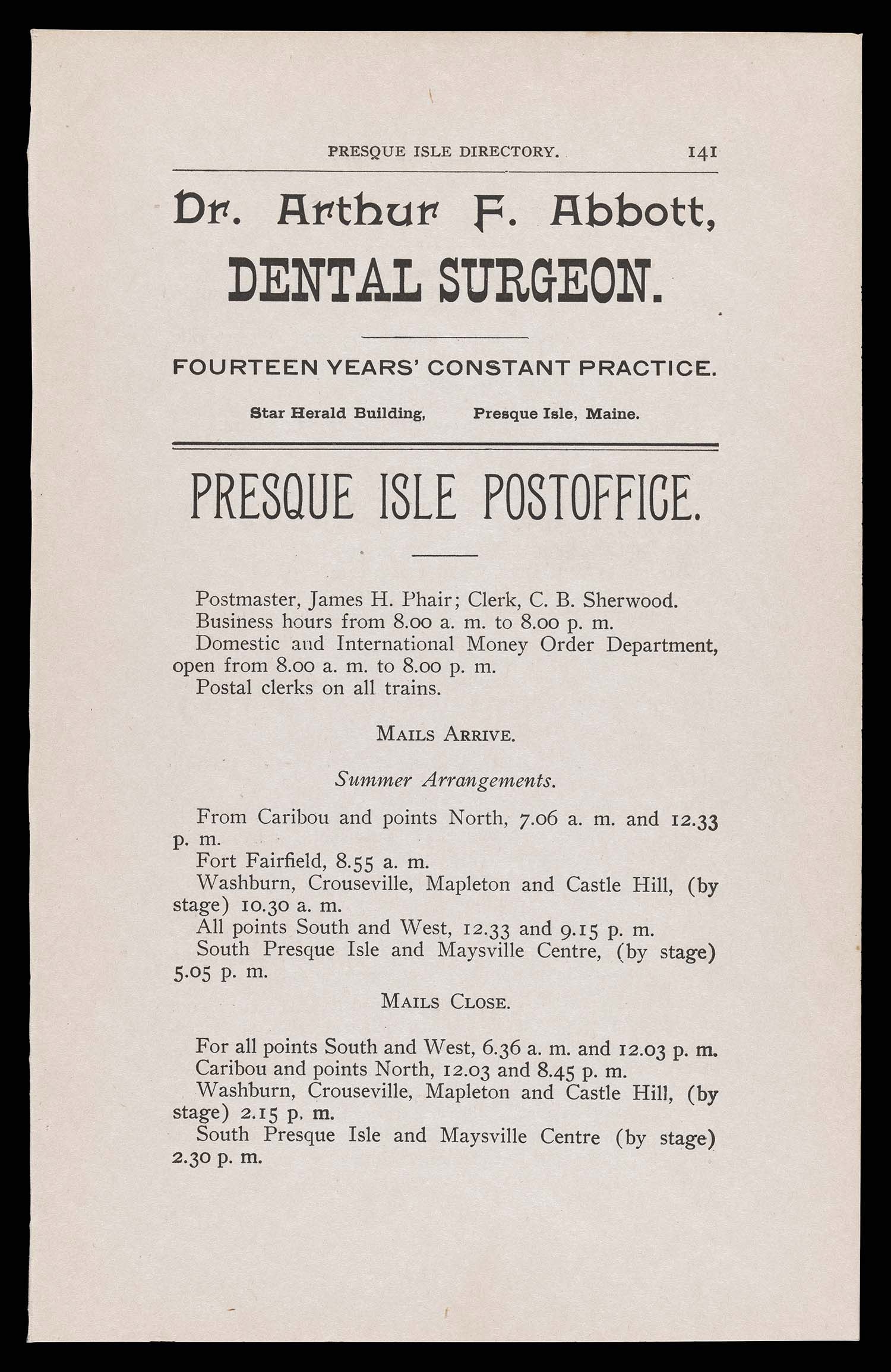 Name: The Presque Isle Directory. Presque Isle Postoffice.