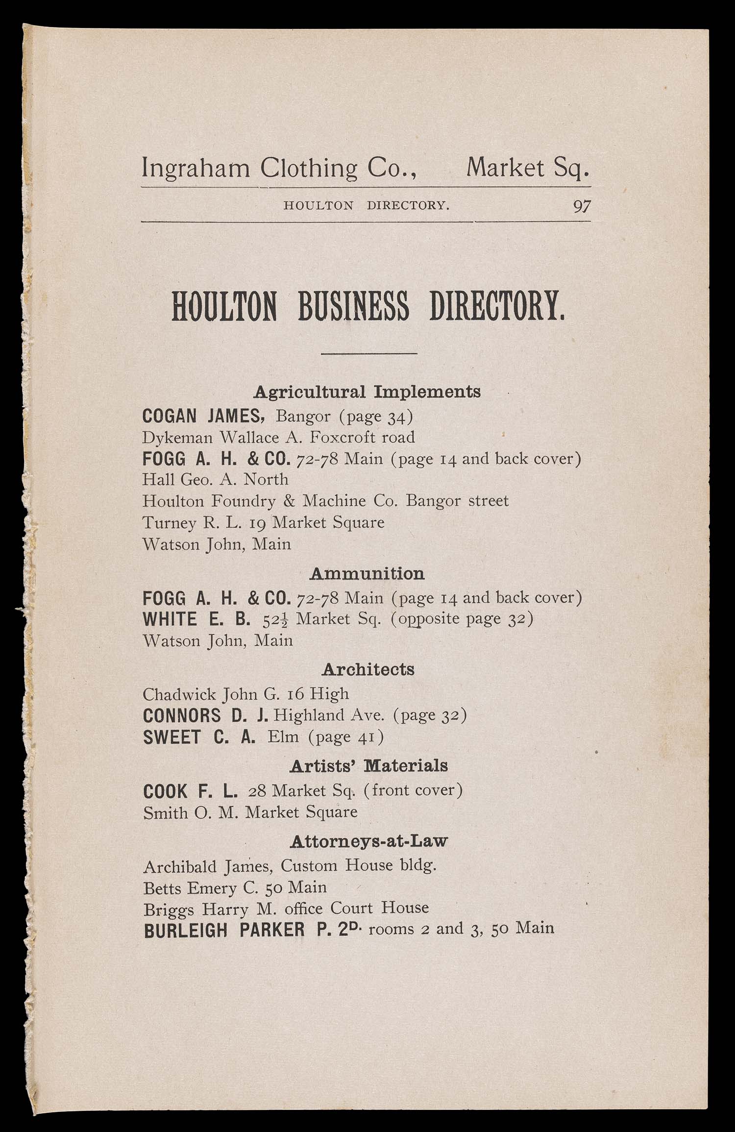 ↑ Parent: The Houlton directory, 1900 : a complete index to the residents, business, streets, etc. of the town of Houlton, Aroostook County, Maine with other useful information