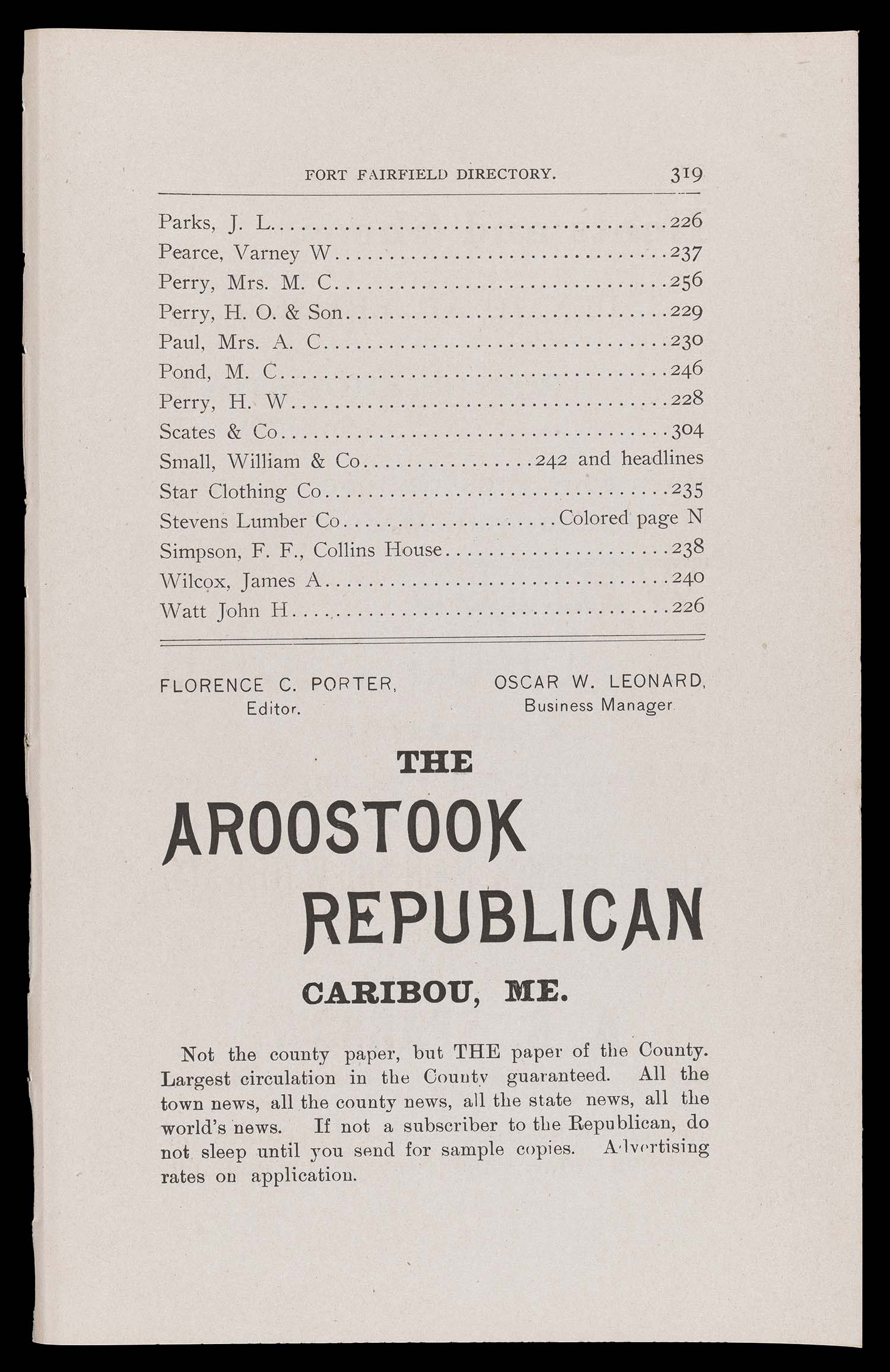 ↑ Parent: The Houlton directory, 1900 : a complete index to the residents, business, streets, etc. of the town of Houlton, Aroostook County, Maine with other useful information
