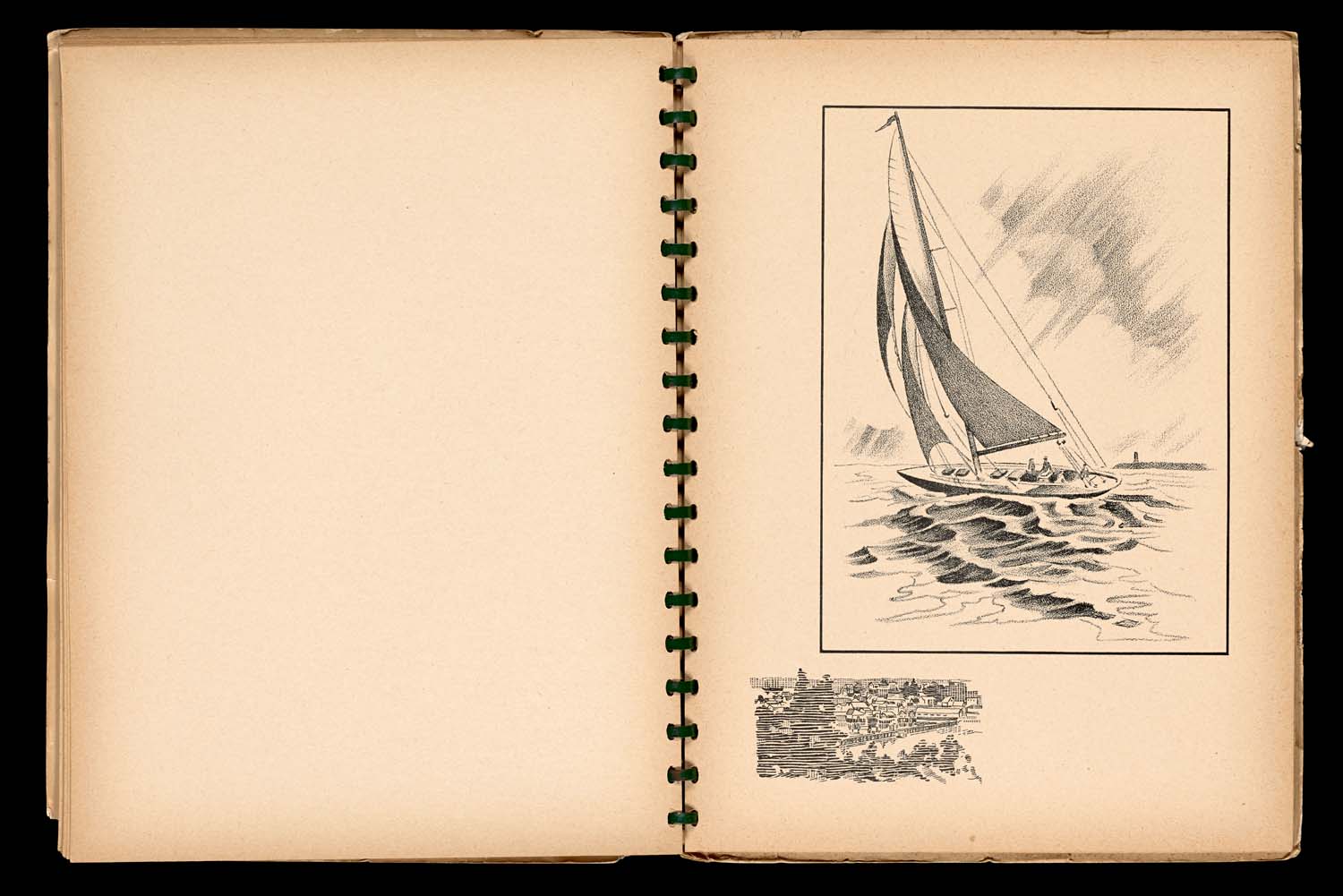 Notes: [Title taken from previous page. Image is of a single mast recreational sailboat. Small image of Boothbay Harbor in the bottom left foreground.]