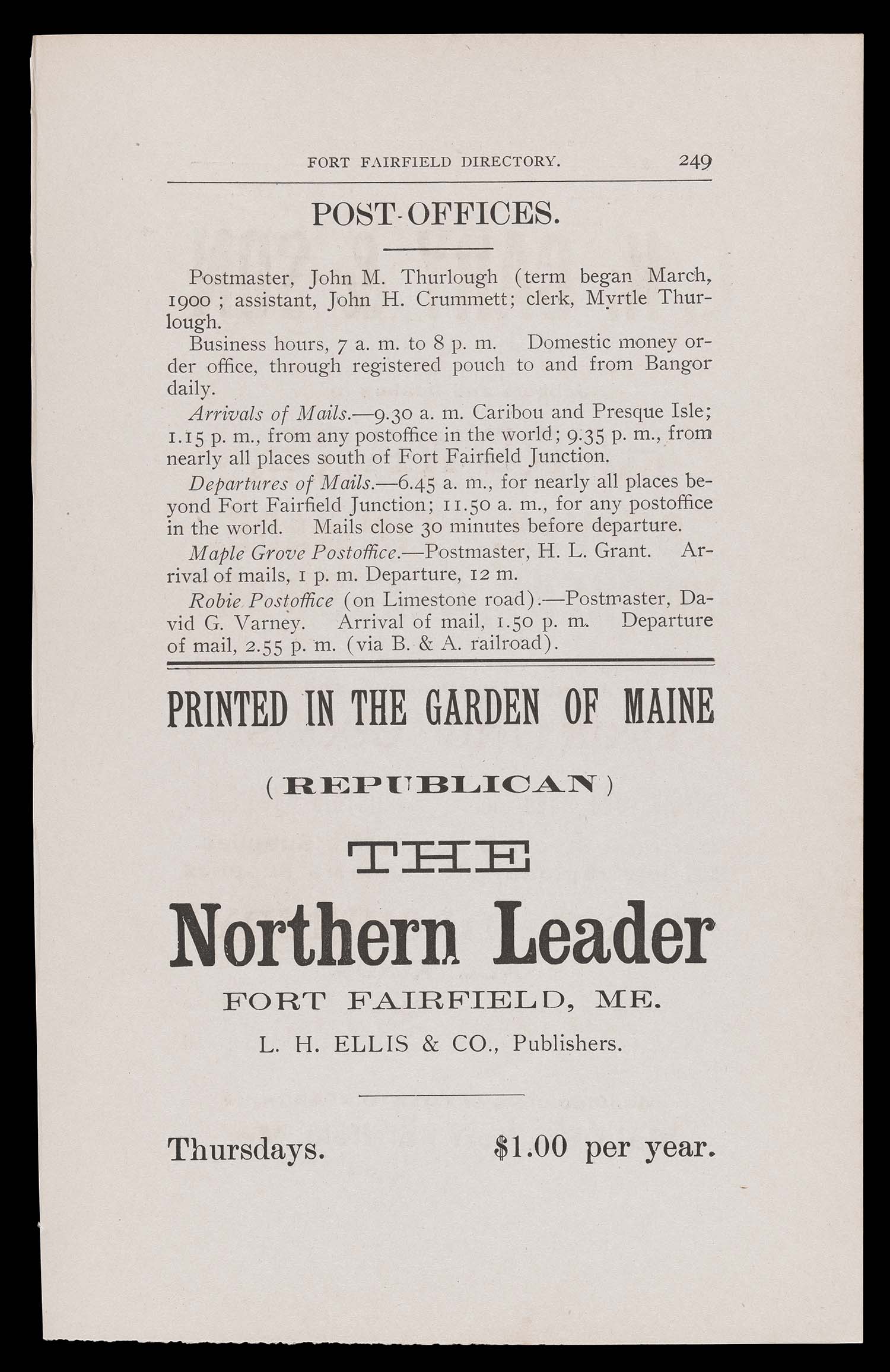 ↑ Parent: The Houlton directory, 1900 : a complete index to the residents, business, streets, etc. of the town of Houlton, Aroostook County, Maine with other useful information