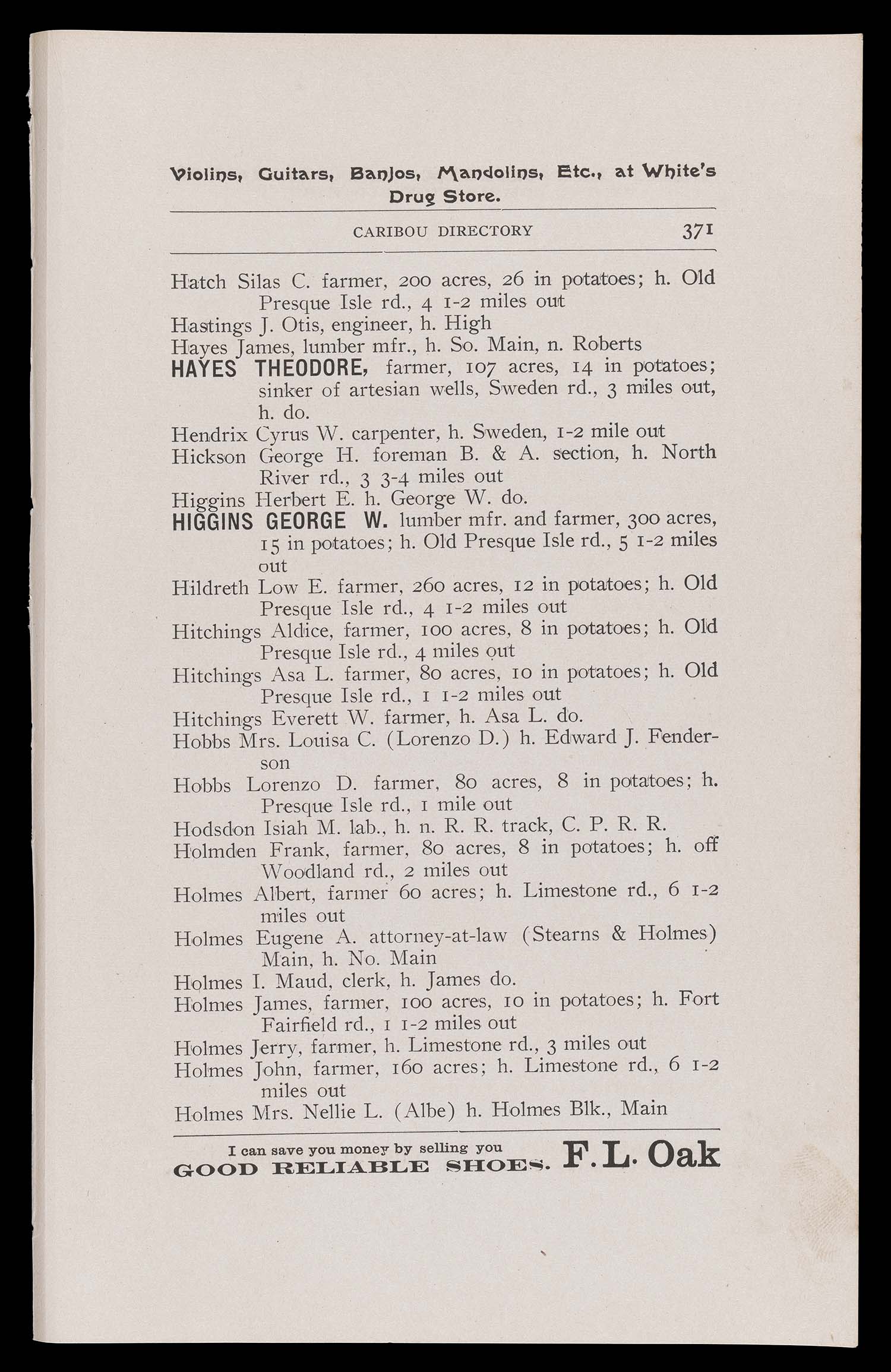 ↑ Parent: The Houlton directory, 1900 : a complete index to the residents, business, streets, etc. of the town of Houlton, Aroostook County, Maine with other useful information