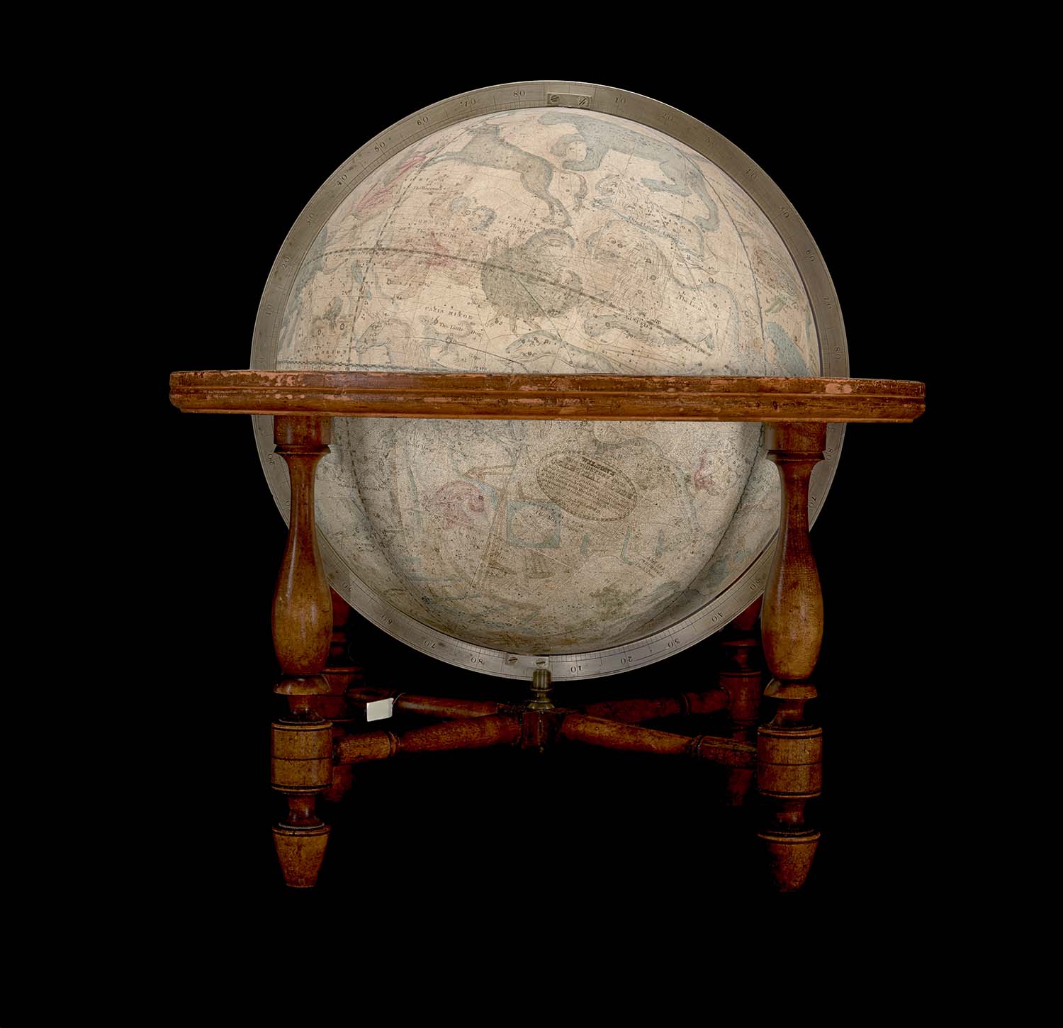 Physical Description: 1 globe: hand colored, paper gores over papier-ma?che? core, mounted in a wooden stand with 4 legs supporting a wooden circle with mounted hand colored zodiacal paper and a brass meridian ring