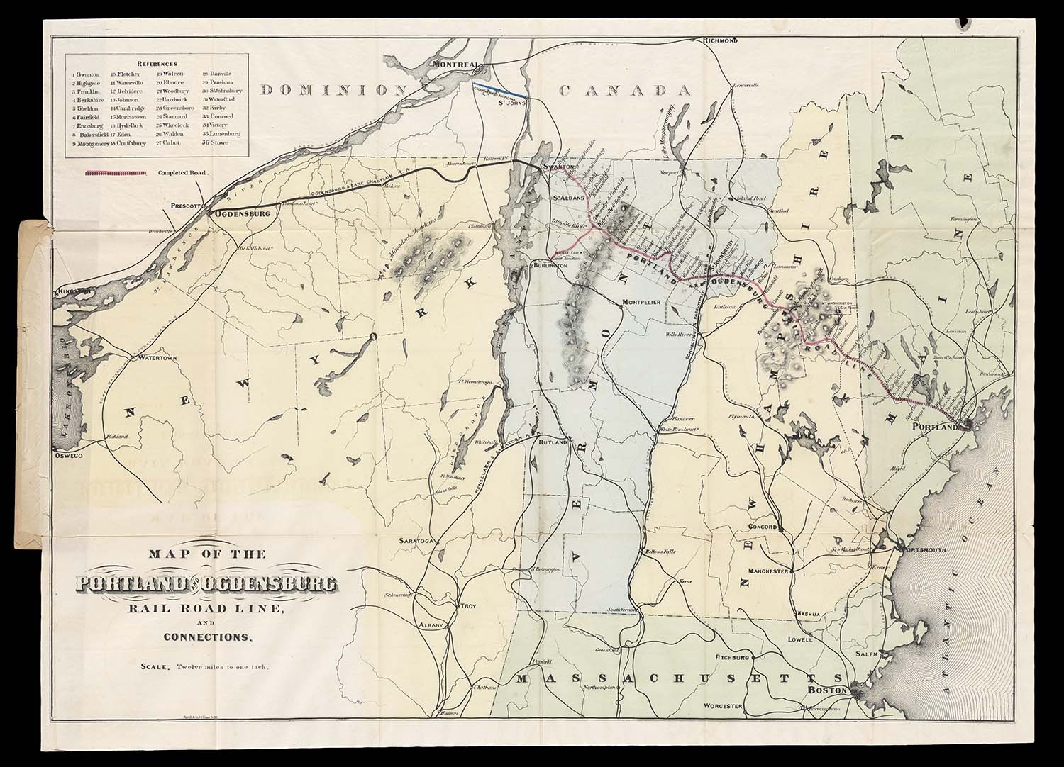 Portland and Ogdensburg Railroad Company, The Port-land and Ogdensburg Railroad Line, Eastern division. Vermont division : the resources, population, wealth, business, manufacturing capabilities, and tourist attractions of the country tributary thereto : also, its relation to the territory and commerce of the Great Lakes, 1872. (www.oshermaps.org/map/7809)