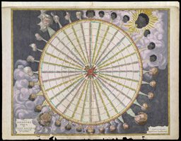 Over the centuries, an increased diversity of names for the winds and ambiguity about the direction they came from, produced a multitude of different wind systems. To create order out of the tangled confusion of names and directions, cartographers produced wind roses such as this by Jan Jansson in 1650. Thirty-two points (directions) are shown and labeled with various directional names for the winds. But to sailors plying the waters of the open oceans, a wind blowing from Thrace (Thracias) lost all relevance in defining direction. Eventually, the wind rose, overburdened by a multiplicity of names and obtuse symbolism, gave way to the directional system of north, east, south, and west, with their intermediate compounds, as used today. Note the fledgling emergence at the perimeter of the circle of a more abstract directional system--degrees of arc of a circle. Even here, the cartographer is unable to resist introducing variations.