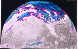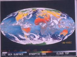 This composite global view (T22) of temperature, visible cloud, and water vapor was produced by the University of Hawaii at Manoa, Department of Meteorology. Using infrared photographs received from a GOES satellite, the image is color enhanced to clearly distinguish temperatures of various features. Compare the colors of mid-range temperatures here, with those in the center of Hurricane Dennis on chart T18c; in the center of Dennis, temperatures are in the 167° to 176° Fahrenheit range. GOES satellites are geostationary, that is, they orbit the earth at the same speed as the earth's orbit, thus allowing the view to be kept constant.