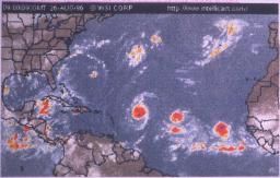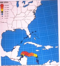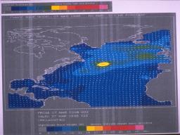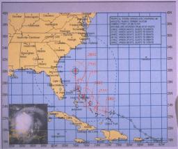Three years later, Tropical Storm Dennis whose track is shown here in black, intensified to become a hurricane when it reached 71°W. The red track shows not only the predicted path of Dennis, but the indication that it will intensify to reach wind gusts of 123 MPH by August 28th. Compare this chart with the color enhanced satellite image (T19a) of Dennis, and the global weather chart (T22) produced by the University of Hawaii, all three downloaded from the Internet on August 25th.