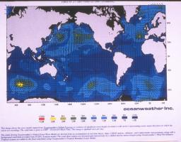 The importance of changes in sea surface temperature was dramatically thrust into general public awareness by the 1997-1998 El Niño phenomenon. Oscillations in the locus of normal water temperatures in the equatorial Pacific, along with attendant changes in sea level height and wind patterns, are normal occurrences. Periodically, these changes become exaggerated; when they do they result in the condition called El Niño, characterized by unusually warm temperatures along the west coast of North America at the equator, and its corollary, La Niña, with abnormally cold temperatures there. When these anomalous conditions occur, climate systems around the entire globe are affected. In some areas the result is excessive rainfall with destructive flooding, in others, severe drought producing extensive forest fires. Commercial fishermen are also affected. Higher water temperatures reduce the supply of nutrients, which in turn, adversely affects marine ecosystems and fish populations. Normally, easterly tradewinds pile up warm surface water in the western part of the Pacific, resulting in a higher sea level there. On maps T6 and T6a the La Niña condition of cool water (indicated in blue and purple) off the coast of South America is clearly apparent. Satellite measurements that made these maps include the height and temperature of the sea, with incredible accuracy. The red areas are four inches above normal, and the purple areas seven inches below normal. Differences in height as seemingly insignificant as these nevertheless affect the heat temperature of surface waters.