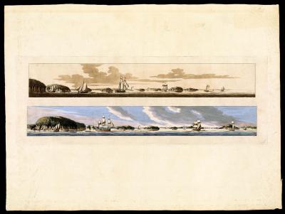 Plan, or bird's-eye, views of land on nautical charts in pilot books were often accompanied by horizon profiles of the coast. These small scenes depicted the land as a mariner would see it when approaching from seaward, and aided him in identification to assure a proper landfall. In the centuries following their introduction they were sometimes elevated to exquisitely detailed landscape engravings or watercolor drawings, far surpassing in aesthetic appeal their original intended function.