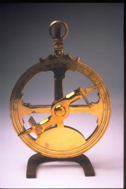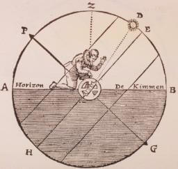 In the Middle Ages, the instrument used for measuring the angular height of a celestial body above the horizon was the planispheric astrolabe. This instrument adapted to one more suitable for "taking the height" while at sea--the nautical astrolabe. Consisting of a perforated disc made of bronze or brass, which gave it weight, the astrolabe was suspended from a ring at the top. Affixed to the center of the disc was a sighting bar called the alidade, which could be turned in a complete circle. The navigator aimed the alidade at the heavenly body, either the sun during the day or the pole star at night, aligning it by sighting through holes or notches in plates at each end. He read the altitude in degrees directly off a scale inscribed around the circumference of the disc. In the illustration here, from The Light of Navigation (1612) by Willem Jansz Blaeu, line P-G is the angle of the axis of the earth at the time the celestial observation is made; this angle taken from astronomical tables. Z equals zenith, and D is the observed altitude of the sun. To obtain a noon position fix from the sun at its meridian passage, the observed altitude of the sun is subtracted from 90° and the declination of the sun is added algebraically to the result.