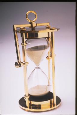 In navigating long distances across the open ocean, the sand-glass for making time was as important an instrument as the compass for showing direction. Filed with the amount of sand to measure a half hour of time, each emptying of the sand was called a "glass", and eight glasses (four hours) made up one "watch." The compass and sand-glass, along with a chip-log to measure speed, enabled the navigator to plot his ship's position on a chart. Speed times time gave the distance, and the compass showed the direction of the course sailed. This simple method of navigation is called dead-reckoning, short for deduced reckoning.