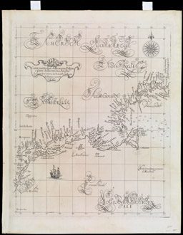 Southack captained vessels in New England waters for 22 years. His New England Coasting Pilot (Boston, 1729-33) summarized the wealth of information he had collected about the coast, its hazards, and its currents. Southack's lists of sailing directions and eight charts guided ship's captains all the way from the Hudson River to Nova Scotia. Although criticized in the colonies as quite inaccurate, Southack's work was adopted by London chart makers. The present map was produced in 1744 by combining the eight charts from Southack's atlas into a single map; between 1775 and 1794 it was often reprinted in the principal English navigational manual for North America, The English Pilot, The Fourth Book.