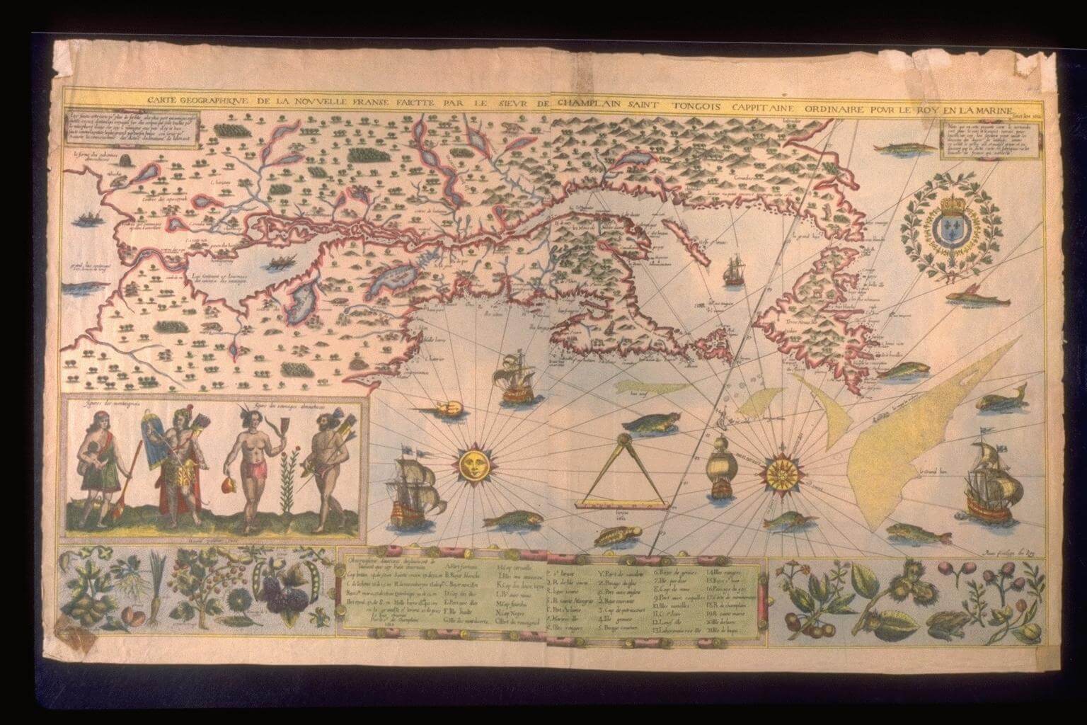 Champlain merged his general information regarding the New England coast with his later explorations of the St. Lawrence valley (to 1612). The result is his large and ornate general map of New France (15). Even on this map, however, Champlain refers to the manner in which he himself had seen this entire region by including the ethnographic and botanical drawings (15).