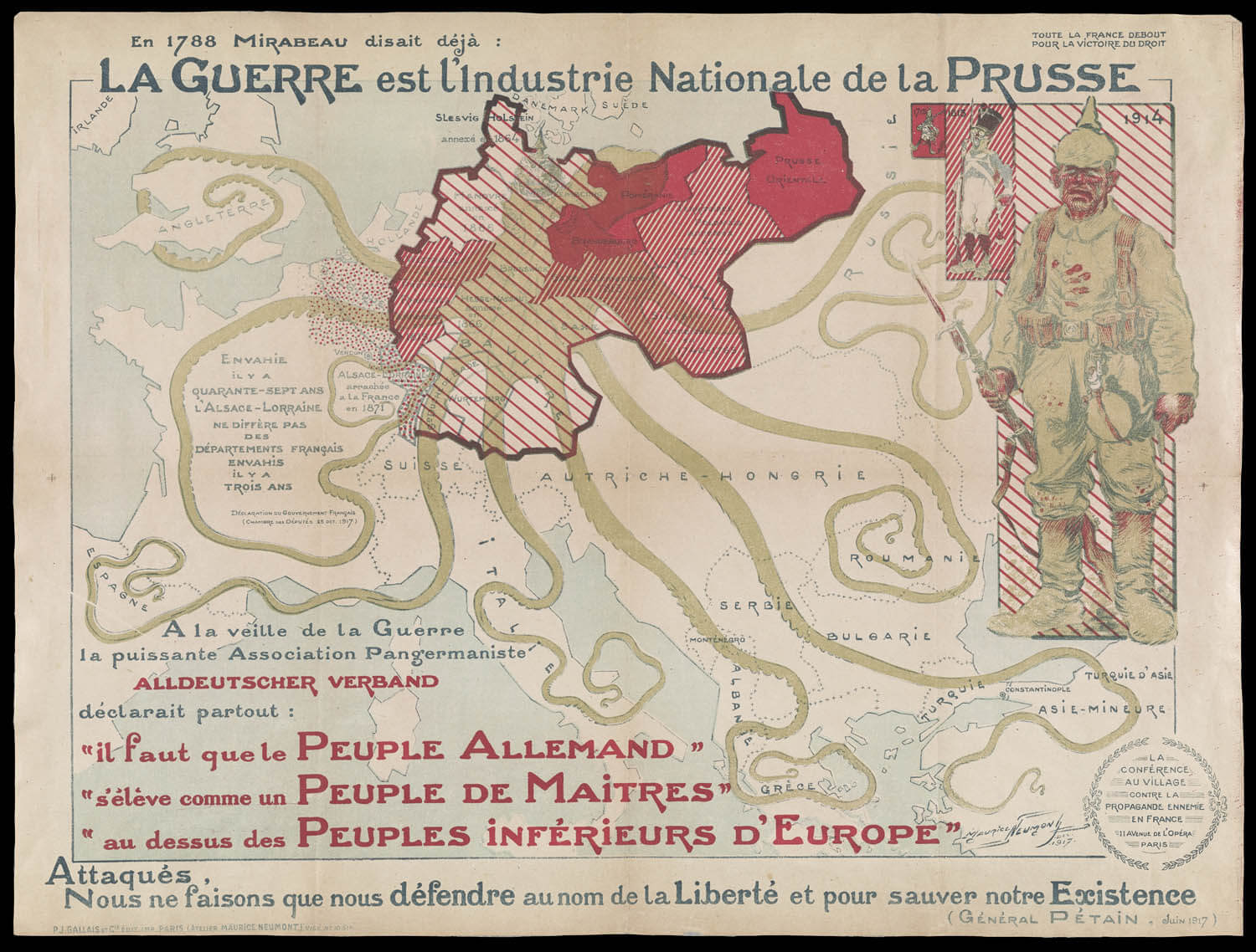 The red areas on this map mark the territory of Prussia, which had forcefully unified Germany after 1871. The solid red shows Prussia's 1715 domain, and the compact red stripes highlight the areas annexed by Prussia between 1715 and 1815. The wide-set stripes show the additional land annexed or occupied by the new German Empire by 1914. To the right, the size of the Prussian military is represented by the size of the soldier portraits, beginning with a tiny image of a soldier for 1715, a somewhat larger image for 1815, and a significantly larger image for 1914. The 1914 soldier wears a Pickelhaube and carries a rifle fitted with a bloody bayonet. A bloody handprint, often included in Allied portrayals of Germans during WWI, stretches across the soldier's chest as a reminder of the violent war crimes committed by German troops in Belgium and France.