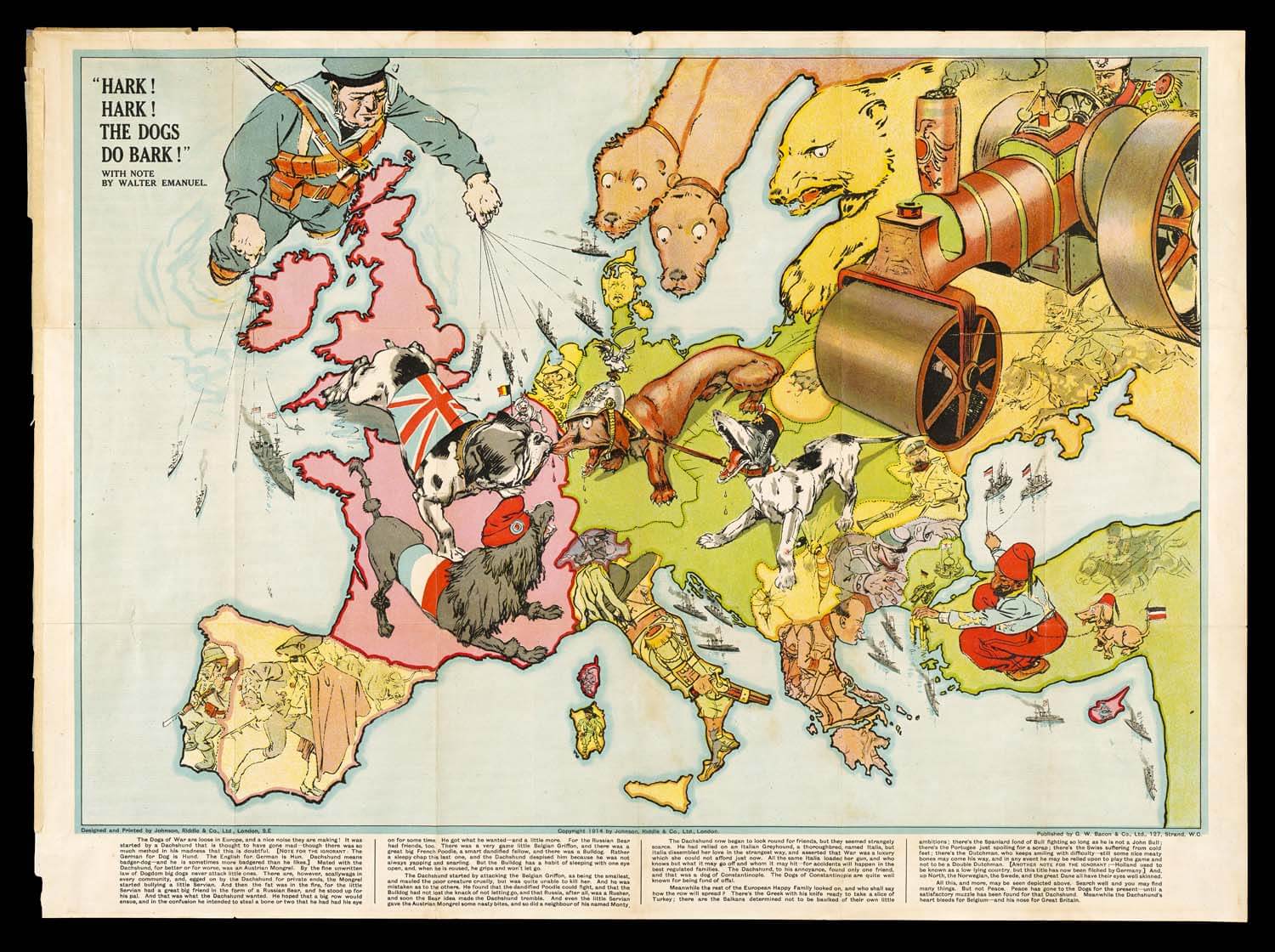 Designed in autumn of 1914 by an unknown Johnson Riddle & Co. employee, "Hark! Hark! The Dogs Do Bark!" populates a map of Europe with illustrations of dogs and other animals, each representing a European country. The map also features a commentary written by a Punch magazine writer, Walter Emanuel, who was well-known in Britain at the time. Emanuel wastes no time in ascribing the cause of the war to the lunacy of Germany, a "Dachshund that is thought to have gone mad." The bug-eyed German canine has whiskers resembling an imperial mustache, wears a spiked helmet, and is being choked by a collar attaching him to an equally overwrought "Austrian Mongrel." The Austrian Mongrel, meanwhile, is being stung by bees representing Serbia and its ally, Montenegro. Opposing the Dachshund are a French Poodle and English Bulldog. The bulldog has a firm bite on the nose of the Dachshund, while shielding a small, injured "Belgian Griffon." Approaching the Dachshund and Austrian Mongrel from the east is Russia, pictured as a steamroller driven by Tsar Nicholas II. In his last paragraph, Emanuel concludes, "Peace has gone to the Dogs for the present--until a satisfactory muzzle has been found for that Dachshund." Intriguingly, this map was copied and released in Germany as an example of British propaganda.