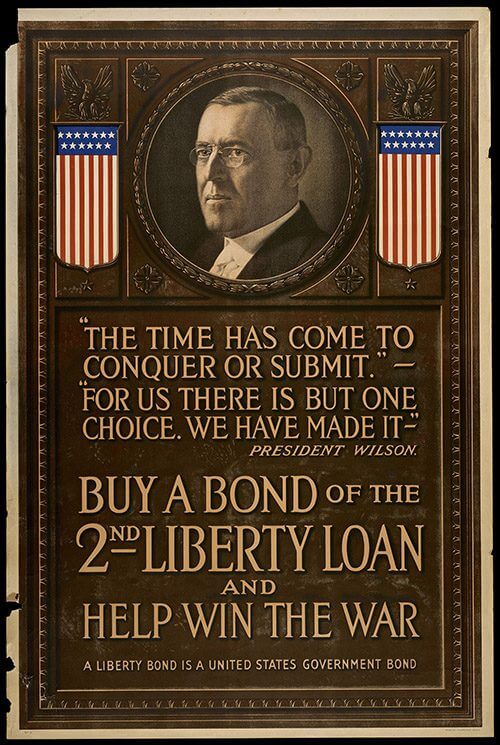 Woodrow Wilson's round portrait in a bronze decorative border, reminiscent of currency, is the central image of this poster. Presented in large print below the portrait is Wilson's quote regarding the U.S. entrance into World War I: "The time has come to conquer or submit… For us there is but one choice. We have made it." A powerful quote, it employs the viewer's pride and sense of duty and justice.