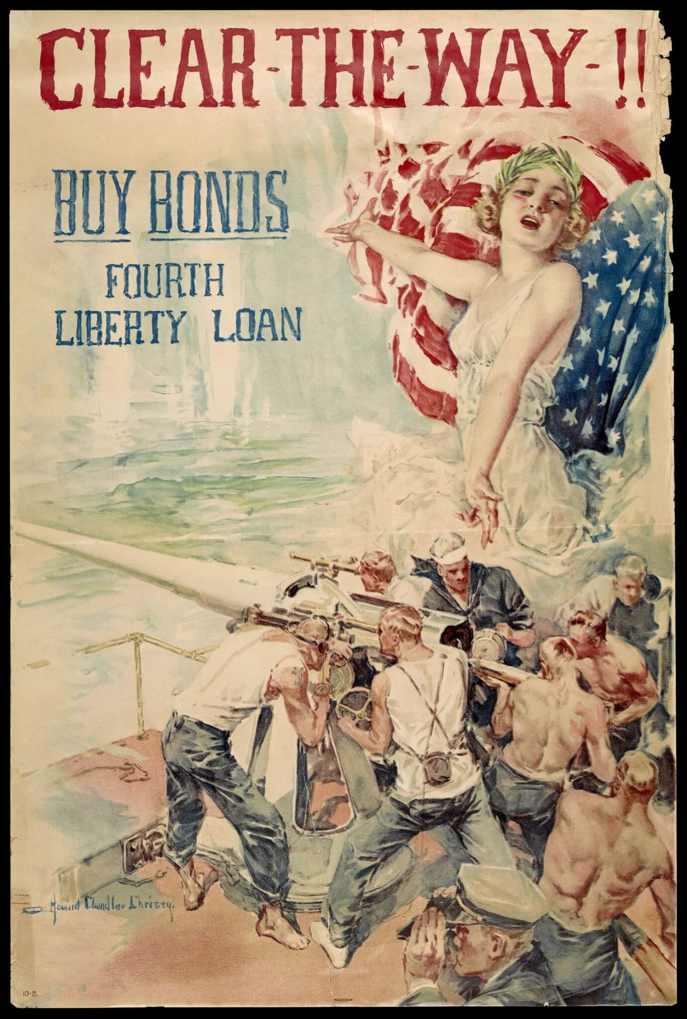 Created by Howard Chandler Christy, a well known illustrator of the early twentieth century, this poster is one of three similar posters each featuring branches of the military. "If you want to fight, join the Marines" and "Fight or Buy War Bonds," which depicts a marching group of Army soldiers (www.oshermaps.org/map/42927), are the other two in the series. Each poster includes a beautiful woman, likely allegorical representations of liberty or America. The personification of liberty in this poster appears to be emerging from the ocean, dressed in white, possibly suggesting innocence, and wearing a laurel wreath, a classical symbol of victory in war. Behind her is an American flag and below her are members of the U.S. Navy in a sea battle, preparing to fire on an unseen enemy target. Barefoot, tattooed, heavily muscled, and universally white and blond, the men are figures of an idealized masculinity. While the explicit message of this poster is "Buy Bonds," another intention, like in Chandler's other two military posters, is to inspire the male viewer to enlist and prove himself to be one of these heroic figures.