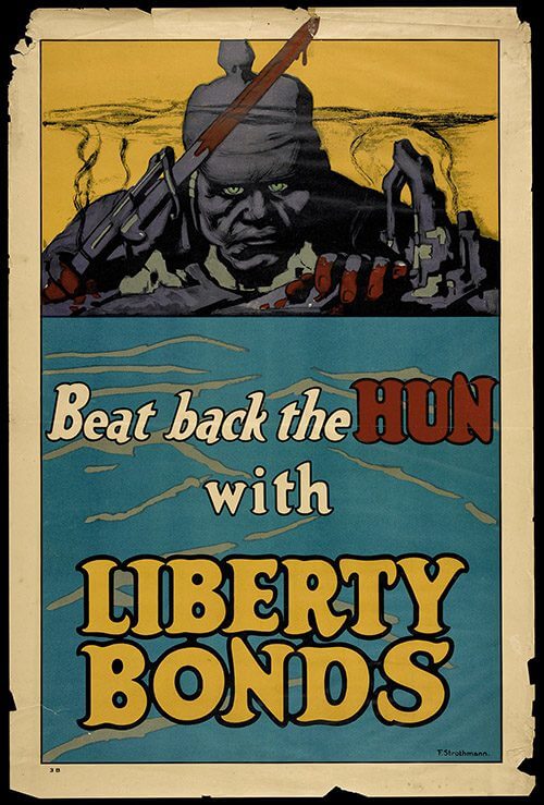 Propaganda posters also legitimized the war effort. By referencing atrocities committed by the Germans in Belgium and at sea, they implied that only the enemy practiced brutality in war; American soldiers were the heroes who stood between the Kaiser’s thugs and their victims. The visual representations of German soldiers often took the form of a bloodthirsty, grotesque caricature, reinforcing the demonization of the “Hun,” a derogatory nickname for a German soldier.