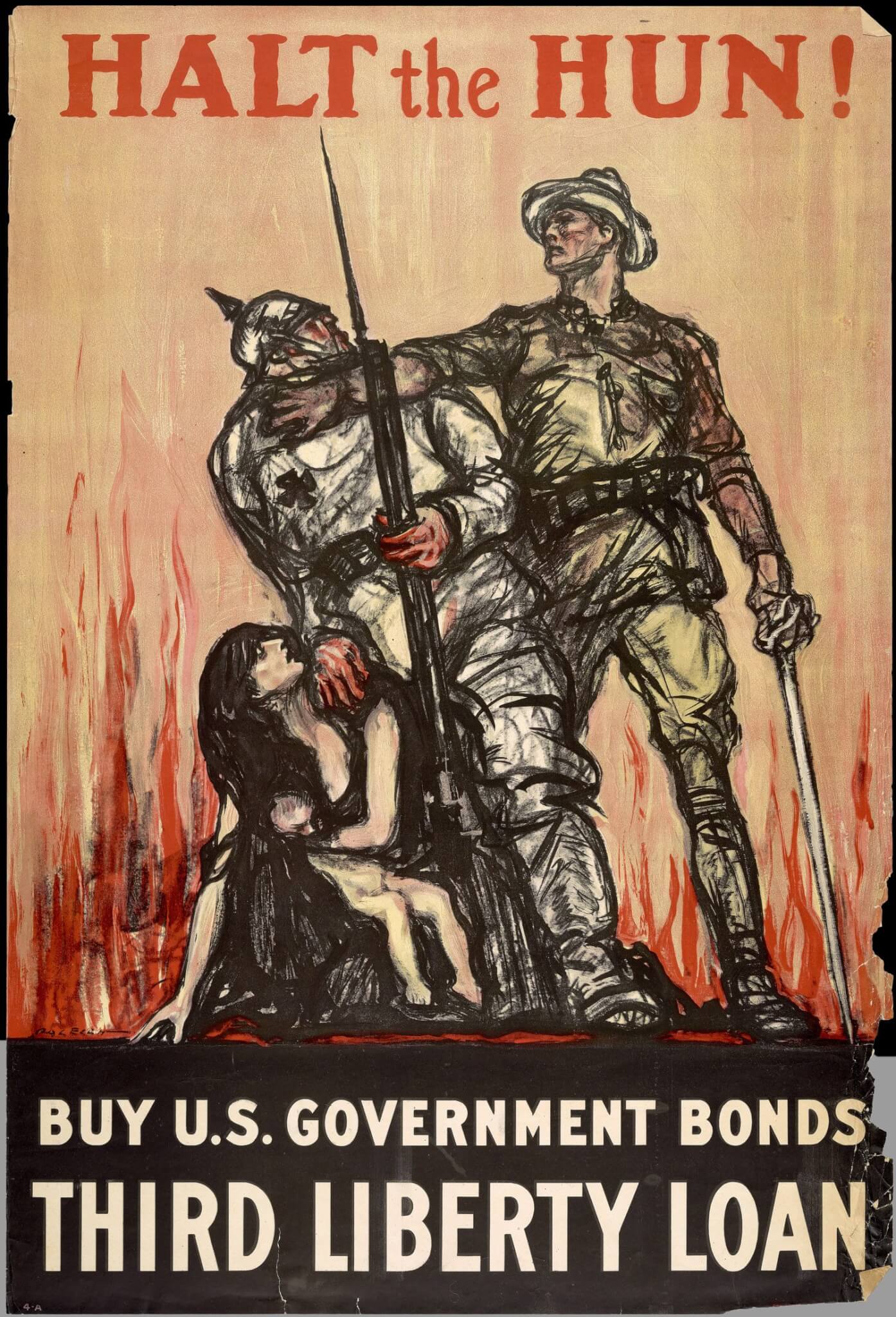 The text of the poster uses concise but strong language. "Halt" is also a German word, and "Hun" was the pejorative nickname given to the Germans during World War I. The Huns of the fourth and fifth centuries were a nomadic people in Europe and were considered uncivilized, aggressive, and barbaric. Typically shown with a spiked helmet, bayonet, and bloody hands, the figure of the Hun is prevalent in the Allied propaganda of World War I.