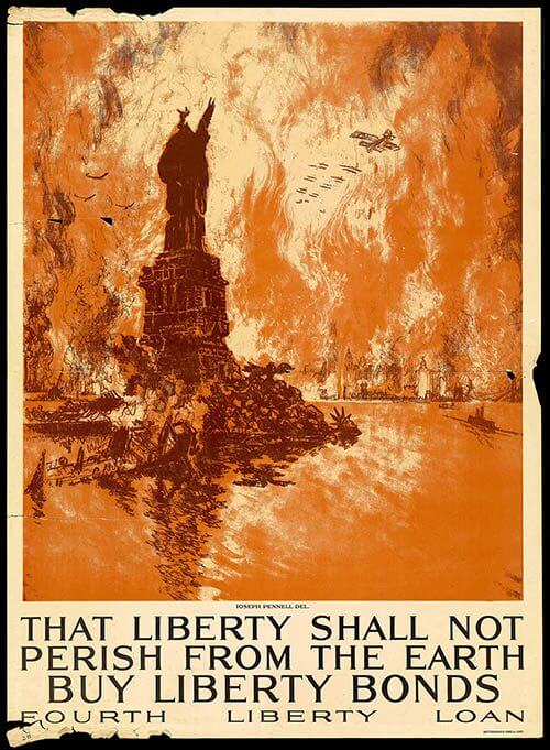The message of this poster is clear; without victory over the enemy in Europe, war could come home to America. The text below the scene implies that, should the Allied forces fail, liberty may "perish from the Earth." The viewer can help prevent this outcome simply by purchasing Liberty Bonds.