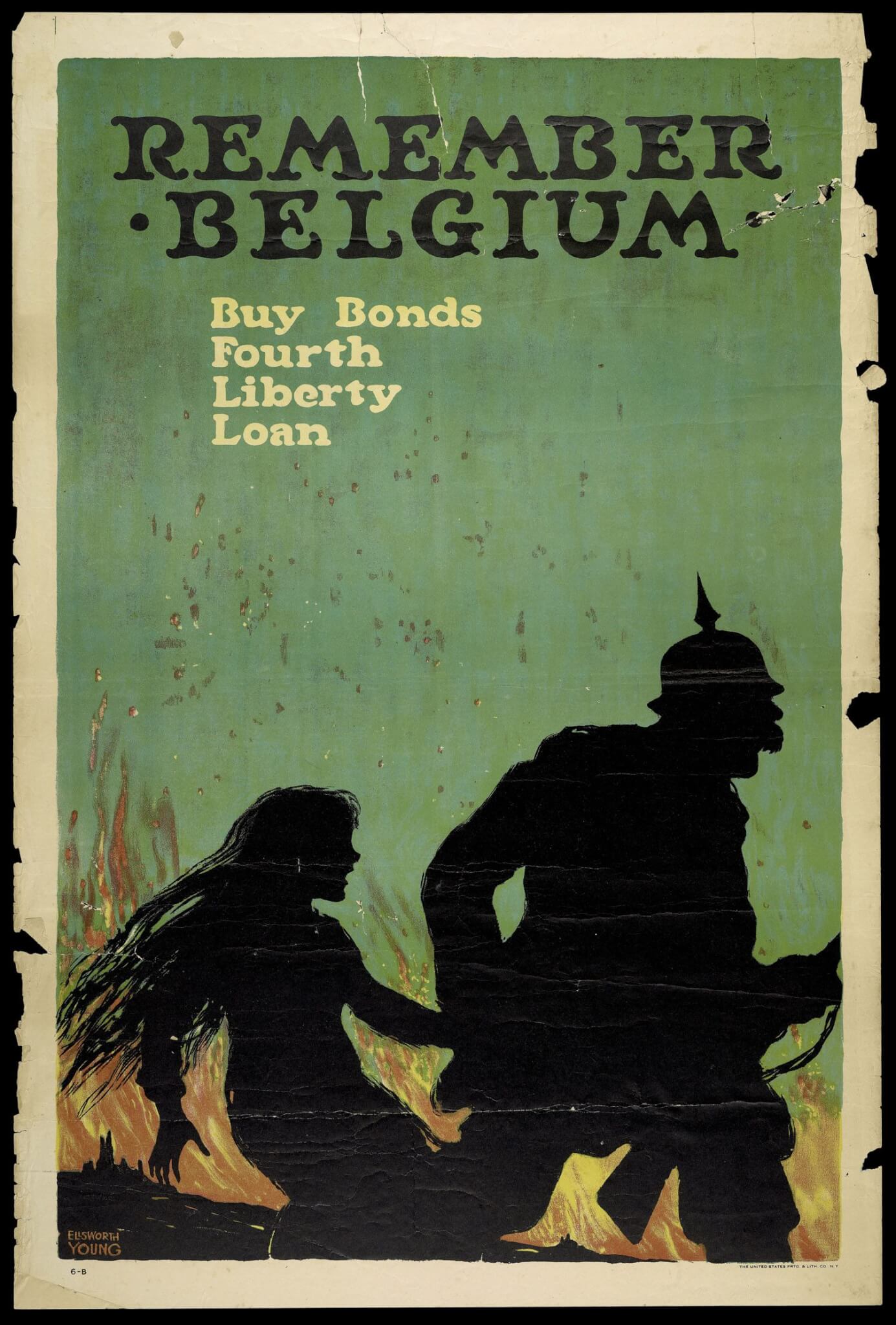 Ellsworth Young's poster was produced after the U.S. joined the war in 1917, making it a few years out-of-date. It's disturbing imagery was nonetheless compelling, making it one of the most well-known American posters of the war. By referencing the lurid reports circulating throughout Allied press of German troops brutalizing children, this image solicits the viewer's outrage and pity. A screaming girl, silhouetted against the burning Belgian landscape, is being forcibly dragged off by a German soldier with a spiked helmet and large mustache. The girl is quite young, her size suggesting that she is only around nine or ten years old. This picture also appeared in an 1918 edition of the Ladies' Home Journal, with the caption, "Somebody's little girl. Suppose she were yours. Buy Liberty Bonds to save her."