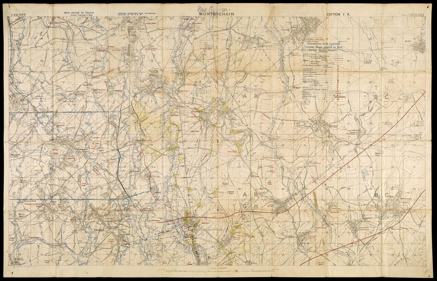 This map of the area west of the Hindenburg Line includes numerous intriguing annotations. The printed information dates to September 19, 1918, the day after the town of Epehy (top-left of the map) was captured by the British 12th Eastern Division. The towns of Bellicourt and Montbrehain lie between the two red printed divisional lines, which suggests that the lines delineate the sector of either the Australian 2nd, 3rd, or 5th Division. However, the addition of two hand-drawn parallel blue lines on the map's left edge, almost certainly representing another divisional sector, suggest that the officer who used it belonged to a different division.