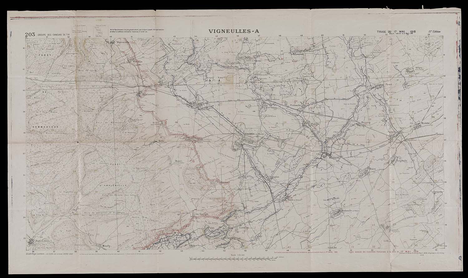 Another French map reproduced by the American 29th Engineers, this map of Vigneulles and the surrounding area includes updated information about the enemy's trenches, likely gathered from aerial photographs taken on May 17, 1918; the note at bottom right translates to "advanced line of trenches on date of 17 May, 1918." This area would see conflict throughout the Meuse-Argonne offensive. On the very first day of the campaign, Riaville and Marcheville (center-left) were attacked by the 26th "Yankee" Division as a diversion to call attention away from the real objective, Montfaucon and Nantillois, a little over fifty kilometers to the northwest. On the last day of the campaign, Ville-en-Woëvre (top-center) was captured by the American 81st Division only hours before receiving news of the Armistice.