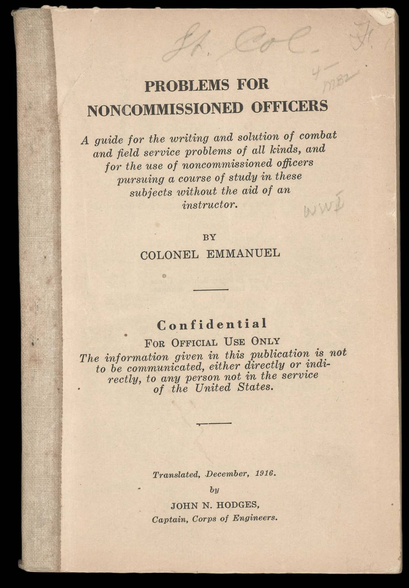 While Problems for Noncommissioned Officers was printed by the U.S. Army Service Schools Press at Fort Leavenworth, the original author, the prolific military theoretician Friedrich Immanuel, was a colonel in the German Army. One of his books on tactics was discovered at the Army War College in Washington D.C. by Captain J. C. Gotwals, who recognized its potential value for students of military strategy. His colleague, Captain John Hodges, translated the book into English and altered the content slightly to better conform with the practices and organization of the U.S. Army.