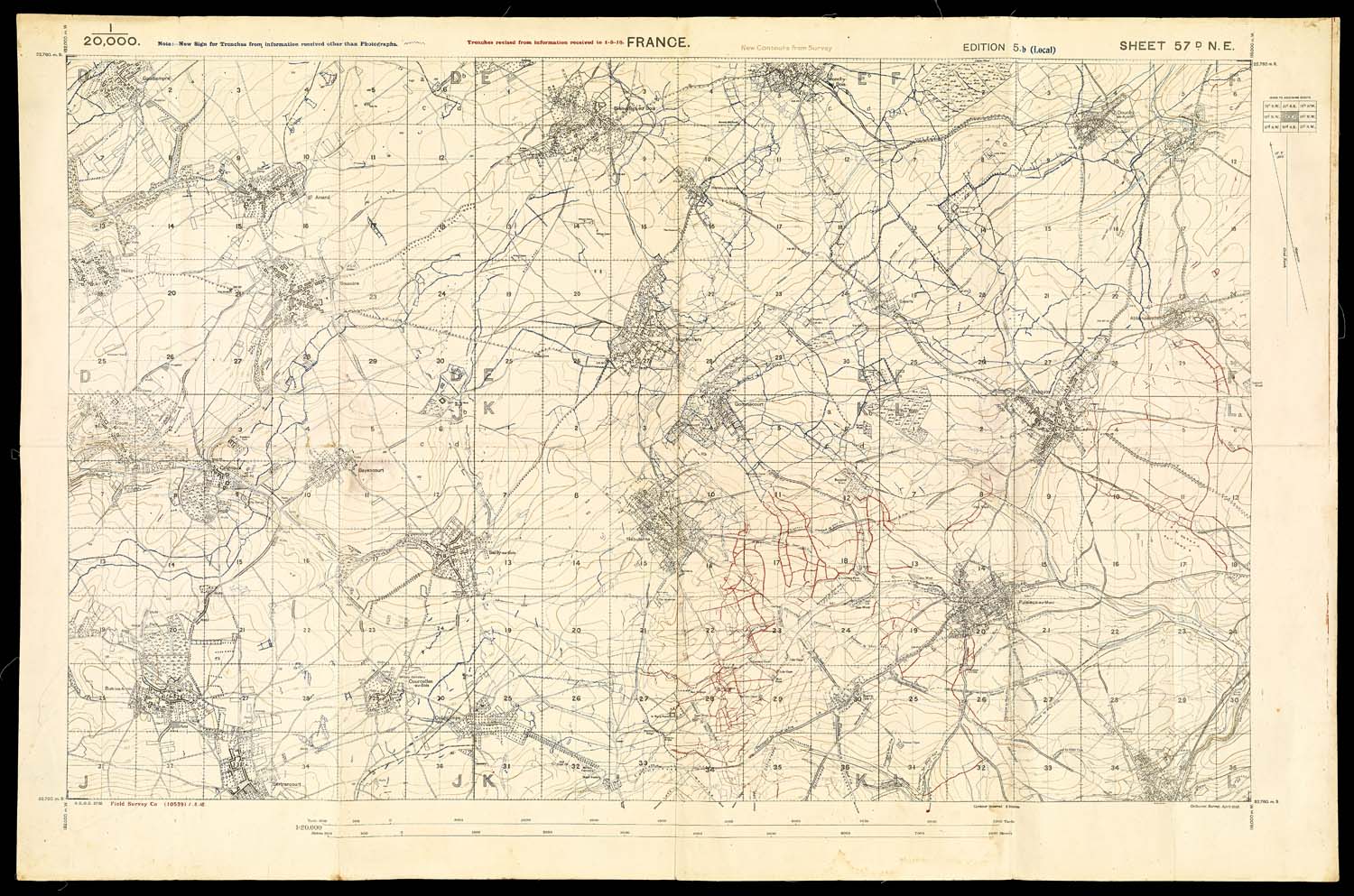 This British map is a good example of a map updated with information gathered through aerial photography. Like all maps intended for use near the front lines, only the enemy trenches are shown; it was deemed too risky to map one's own trenches in case the document were to fall into the enemy's hands. The red lines on the map are the enemy trenches that had been added or altered as of January 5, 1918. As noted in the top left corner, a few of the trenches shown on the map were discovered through means other than aerial photography and are marked differently than the others.