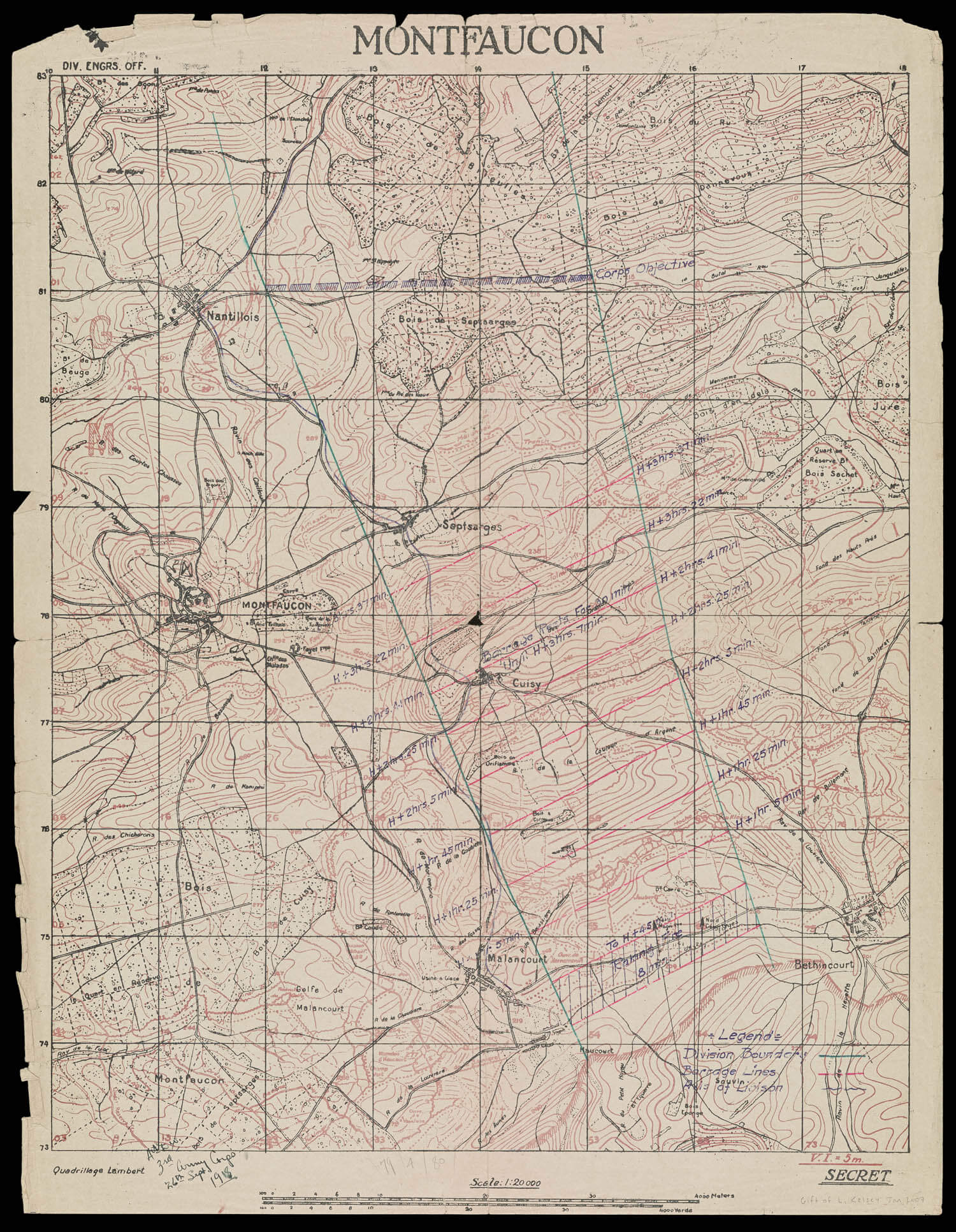 This map shows the rolling barrage lines of the American 4th Division, who were protecting the eastern flank of the inexperienced 79th Division at Montfaucon, a major target in the Meuse-Argonne Campaign. The ultimate objective of the campaign was to capture the Sedan railroad hub, severing the rail net that supported the German Army in occupied areas of France and Flanders. Located on a hill, the village of Montfaucon was extremely well fortified with trenches, entanglements, gun positions, and pillboxes to cover all possible approaches.