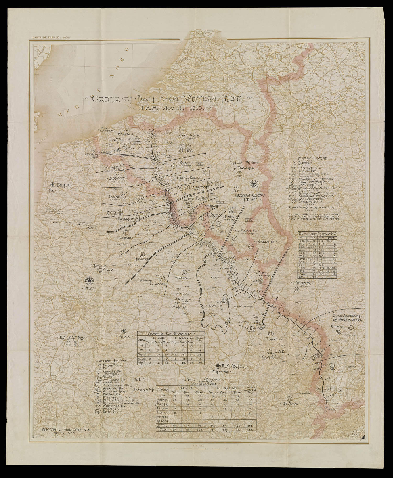 Prepared at the General Headquarters of the U.S. Army shortly after the war, this map shows the locations of both the Allied and German divisions along the Western Front when the Armistice of Compiègne went into effect at 11:00 AM on November 11, 1918, "the eleventh hour of the eleventh day of the eleventh month." On either side of the front line, which stretches from Belgium to the Alps, are shorter lines representing the boundaries between the corps.