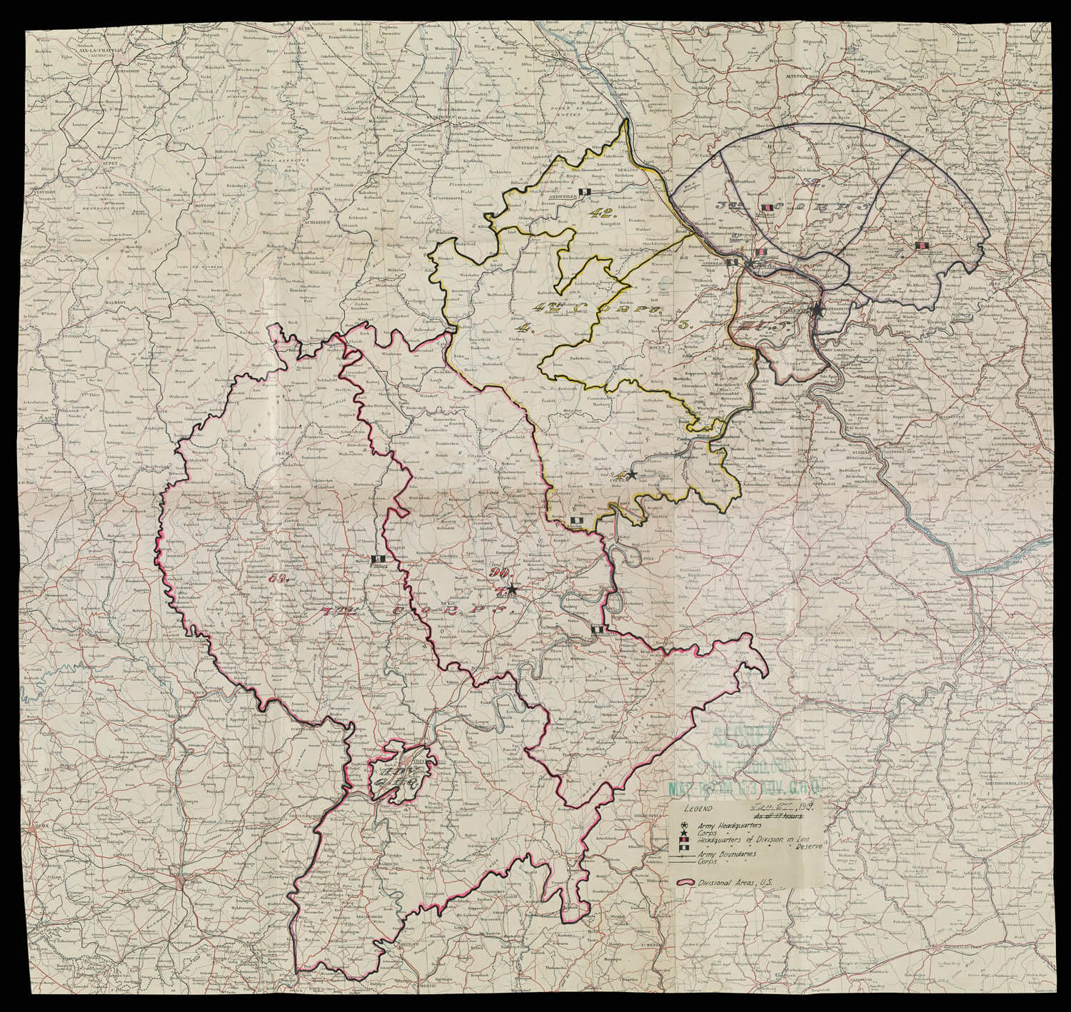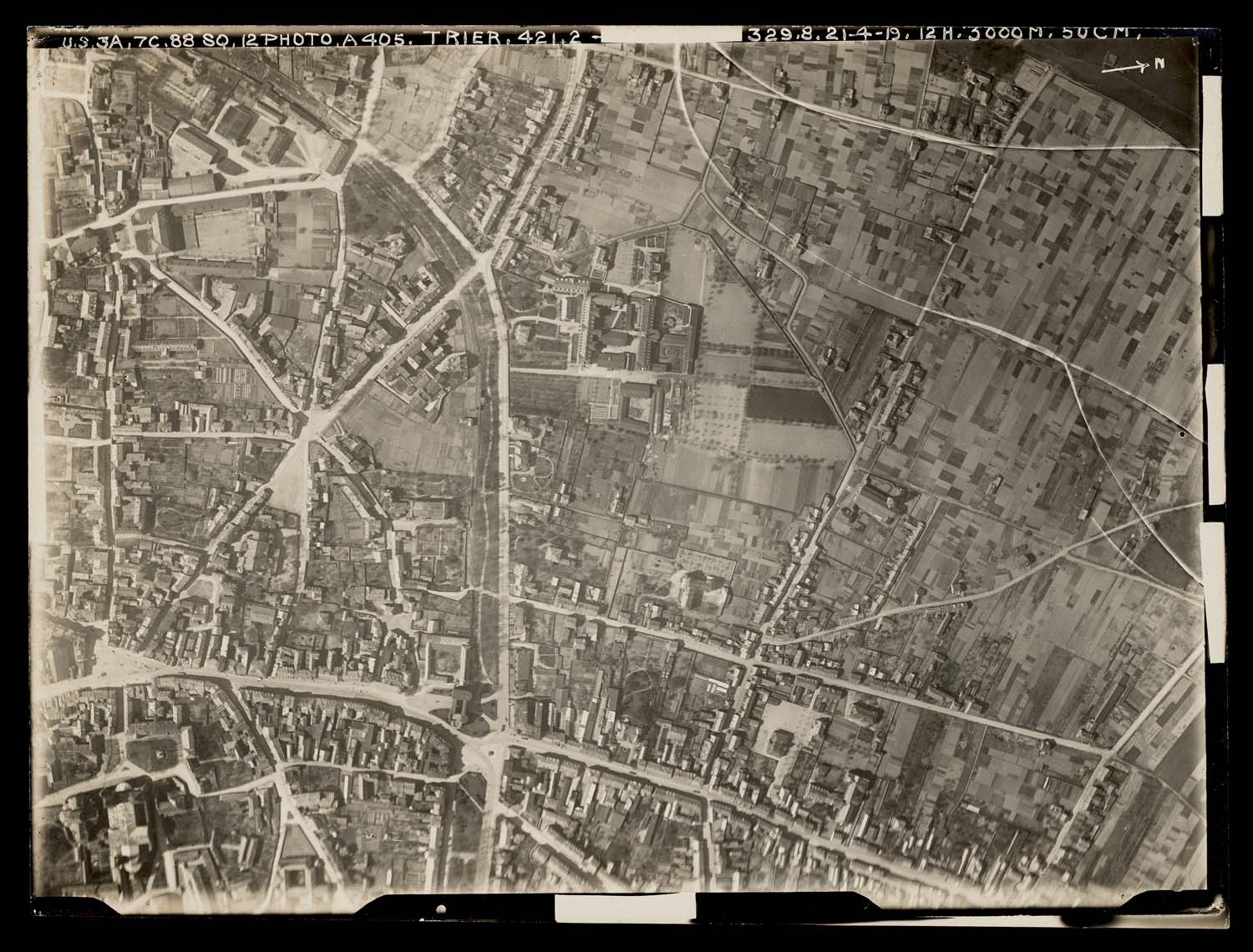 This photograph was taken above Triers, formerly called Treves by the Allies, a city that can also be found in the bottom left section of the previous map (#24). Triers played a role during World War I as a Zeppelin air base for the Germans and, after the Armistice, as the Advance General Headquarters for the American Expeditionary Forces.