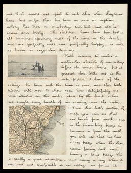Two leaves (fols. 1v and 9r) from a manuscript letter in twelve leaves, 28cm x 21cm, about a recent holiday taken in Kennebunkport, with multiple printed images and maps pasted in.