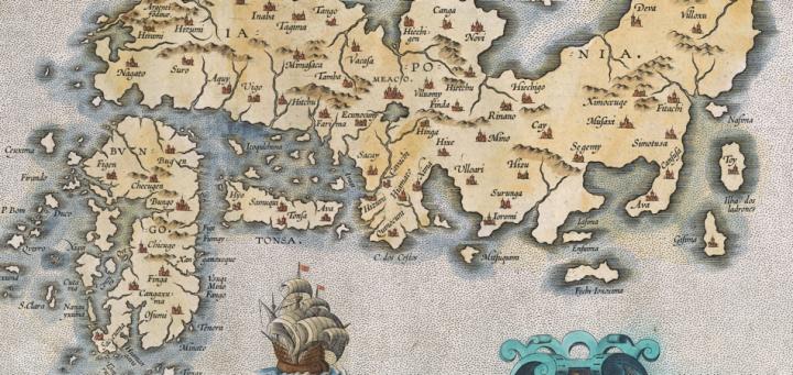 Once a people learn how to visually express their cognitive understanding of the lands and worlds that they inhabit, it is perhaps inevitable that some among them will turn their mind’s eye towards the larger areas surrounding their immediate home. It was precisely such a convergence of the minds of many thinkers and artists that gave rise to the source material from which Abraham Ortelius composed his monumental work, Theatrum orbis terrarium (1570). Amongthe pages of this work,there is an engraved copper print of the rough form of Japan made from a manuscript map originally composed by Portuguese mathematician, cartographer, and royal chart maker Luis Teixeira (fl. 1563-1595: French et al. 1999-2004, 4:257).