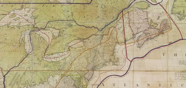Mitchell’s map is large: printed from eight sheets, it measures 136 cm (4'5") high by 195 cm (6'5") wide when assembled. It is known in a total of seven variants prepared over a twenty-year period. The last variant was published in 1775 by William Faden, who changed the title to A Map of the British Colonies in North America (Edney 2007). Close derivatives of the map were also published by Dutch, French, and Italian map publishers (Stephenson 1972).