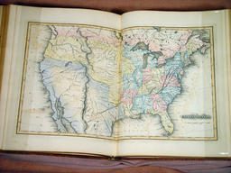 It appears that after 1830, publishers began to combine the maps of some smaller states in their atlases of the United States as a cost-cutting measure. They generally combined the same pairs of states: New Hampshire with Vermont, Connecticut with Rhode Island, Maryland with Delaware [items 26-27]. However, this practice did not detract from the general representation of the Republic as a collection of states. A telling exception to the standard geographical practice of U.S. atlas publishers is offered by the work of Henry Schenck Tanner, who sought to rationalize the atlas-mapping of the United States. Tanner disliked the manner in which U.S. atlases fitted each state into the same size space, regardless of the state’s size; this meant, of course, that many important features in large states like New York could not be shown, while insignificant features of small states like Rhode Island received undue prominence. He therefore published atlases—in both large folio and small pocket varieties—which grouped states together on maps constructed at the same scale [items 28-29]. Because they did not conform with either of the public’s conventional understandings of how the United States was to be mapped, Tanner’s atlases were not commercial successes. Nor, for that matter, were subsequent atlases which divided up the United States along similarly rational lines.