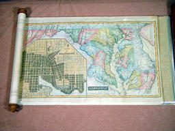 Mathew Carey’s American Atlas (see items 20-21) consolidated the practice of mapping the Republic as an assemblage of individual states. Indeed, this basic structure is still used today for atlases of the United States. However, publishers after Carey did not limit themselves to the Constitutional understanding of the Republic. Fielding Lucas, Jr., for example, prefaced his atlases with a map of the whole Union [item 23]. At the same time, hints of the Republic’s expansive nature were incorporated into these atlases; consider the ambiguous and open depiction of Mexico’s northern boundary in an 1822 atlas by Carey & Lee [item 24]. Of course, the dominant images in U.S. atlases remained those of the individual states. Lucas thus continued the practice of representing one state per page in his curious scroll-format atlas of ca. 1823 [item 25].