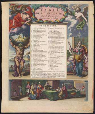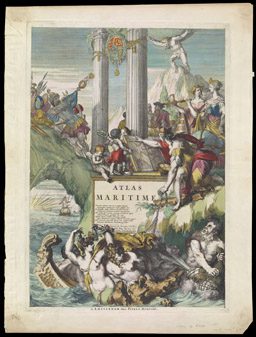 In the upper right of this elaborate title page, Atlas is seen supporting a celestial sphere, his feet rooted in and merging with a tall mountain. At the bottom are characters from the voyages of Aeneas and Ulysses: Aeolus, god of the winds emerging from a cave with his winds contained in a sack or net; and Scylla, a monster with the head and torso of a beautiful maiden and lower quarters consisting of voracious man-eating dogs. In the center, the goddess Fortune is seen as mistress of the seas, protecting the voyagers by giving navigational assistance and holding Scylla in chains.