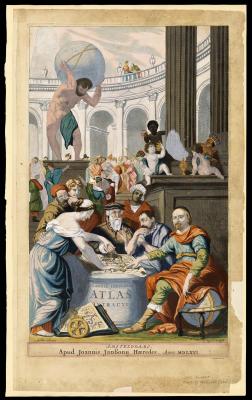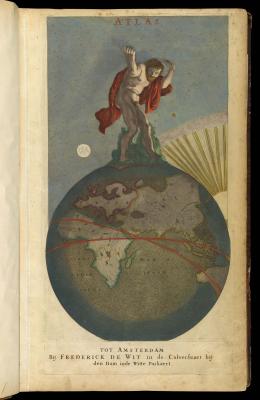 This title page portrays Atlas laboriously holding up the heavens. His feet are enveloped in fabric shaped like mountains, a reference to his transformation.