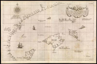 Navigators have long communicated information about the seas and coasts by a variety of means: word of mouth; the written word; graphic images and profiles of the coast; and, charts. Today, most sailors use a combination of charts and written guides. The charts in this section were made for sailing along Spain’s coast and for negotiating her harbors. These activities entail different conceptions of scale and therefore require different types of maps. (Sailing across the high seas requires yet another set of information and navigational forms).