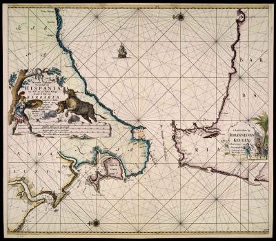 Negotiating harbors and dangerous waters requires a wealth of detailed information about highly localized variations in tides, shoals, and shifting sands. Most of this information has always been held in the minds of the pilots who bring ships in and out of ports, but some of the basic configurations of ports were being mapped in the sixteenth centuries. Seller includes three insets of harbors--top-to-bottom: Bordeaux (France), Cádiz, and Lisbon (Portugal)--on his coasting chart (13). The chart of the Straits of Gibraltar by the Dutch hydrographer Johannes van Keulen is an example of a large-scale chart dedicated to an area of dangerous waters; the map is oriented with east at the top; Cádiz is therefore located in the left hand portion of the map (15). As the major naval port of Spain, Cádiz was the frequent subject of detailed maps, as for example by the Frenchman Nicolas de Fer, géographe du roi ("geographer to the King") (16).
